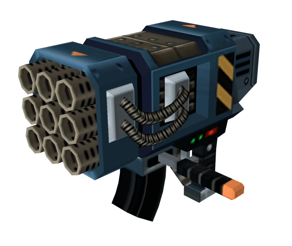 Esta superarma difícil de encontrar dispara una densa lluvia de balas acompañada por andanadas de cohetes.