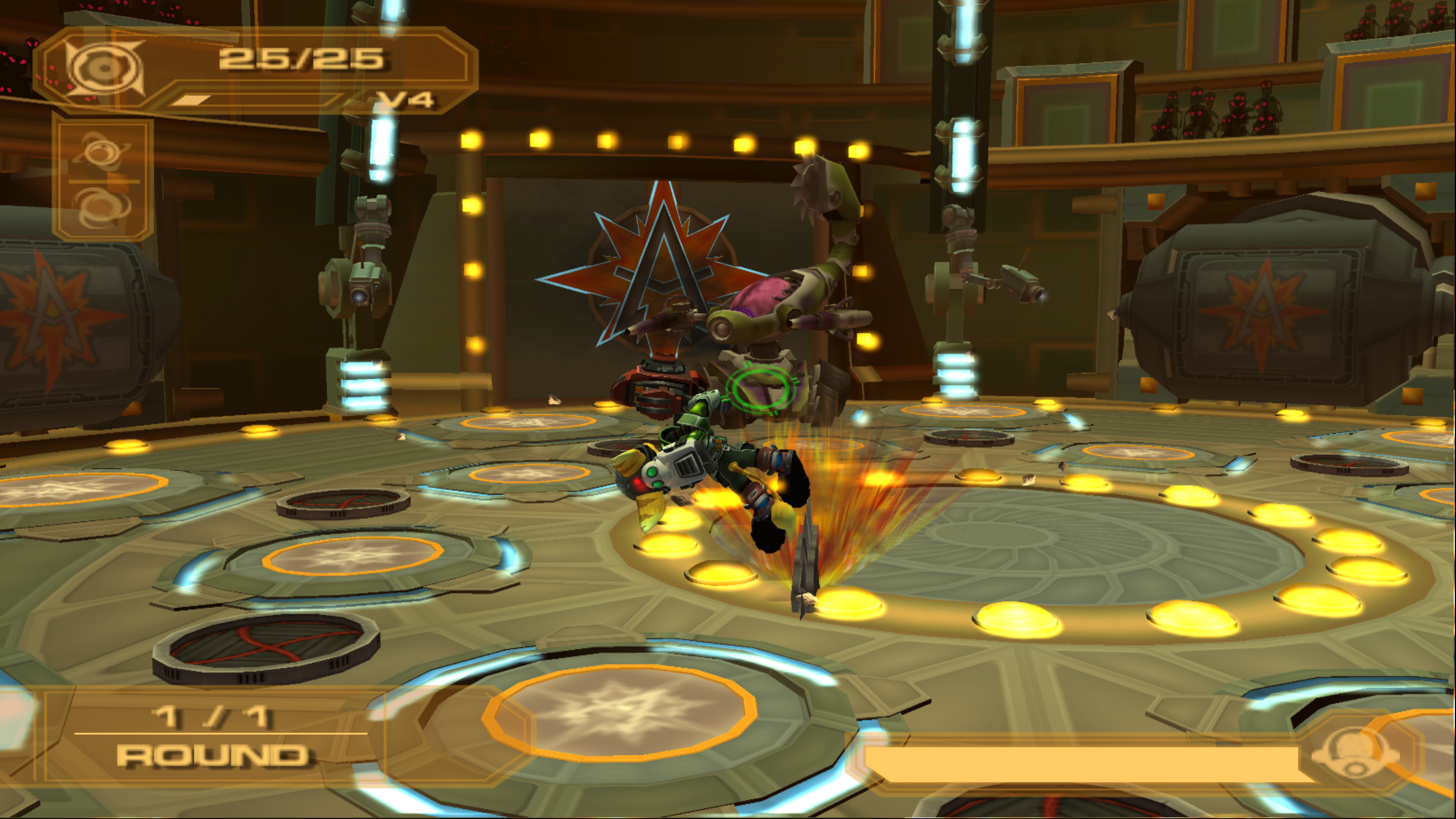 "One Hit Wonder" requires Ratchet to complete the challenge without being hit once. All enemy types appear, and both spinning blade and electric shock hazards appear periodically, making it crucial to avoid them. The floor in the center does not disappear until the final two rounds, making it a fairly safe area until then. However, when it does disappear, the hazards in the outer areas also disappear, making them safe.