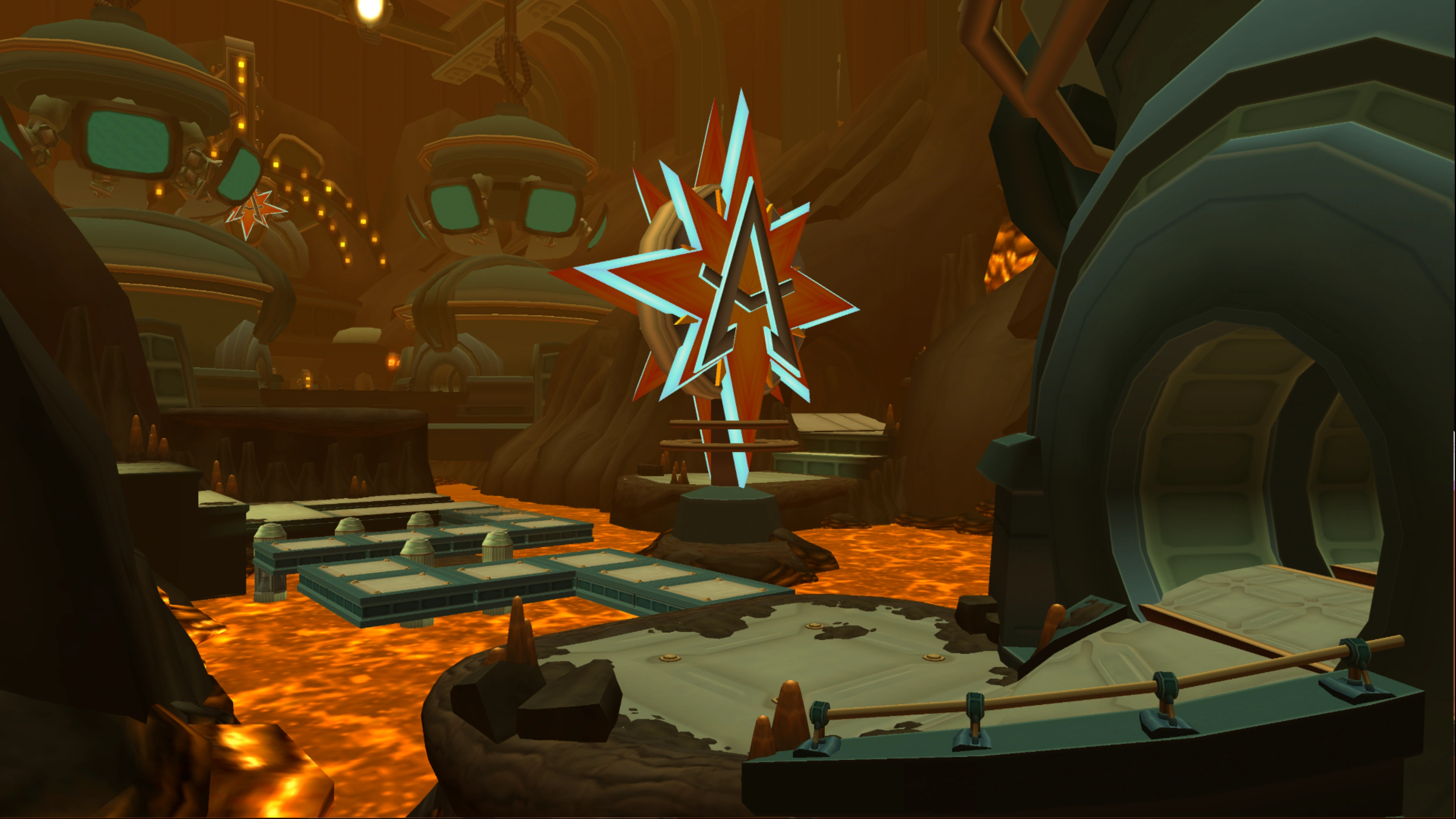 The obstacles in between the rooms include fire traps that occasionally light up, platforms that may fall if Ratchet lands on them, push blocks that will push Ratchet into the lava pit, and small laser turrets that appear from a hatch and fire a green laser as Ratchet approaches. The fire traps, when observed, all follow a pattern, meaning it is possible to predict when flames will activate on a platform, and jump around it to avoid damage. For falling platforms, it is best to simply jump quickly in between the platforms and guarantee safety. Push blocks can be more tricky, as there may not be enough space in between the push blocks to avoid them entirely. In situations like these, it is best to observe when the push blocks expand and retract, and stand on some to then jump further past them when it is safe. For the small laser turrets, either shooting them when they appear can disable them, or the Refractor can avoid any damage from them.