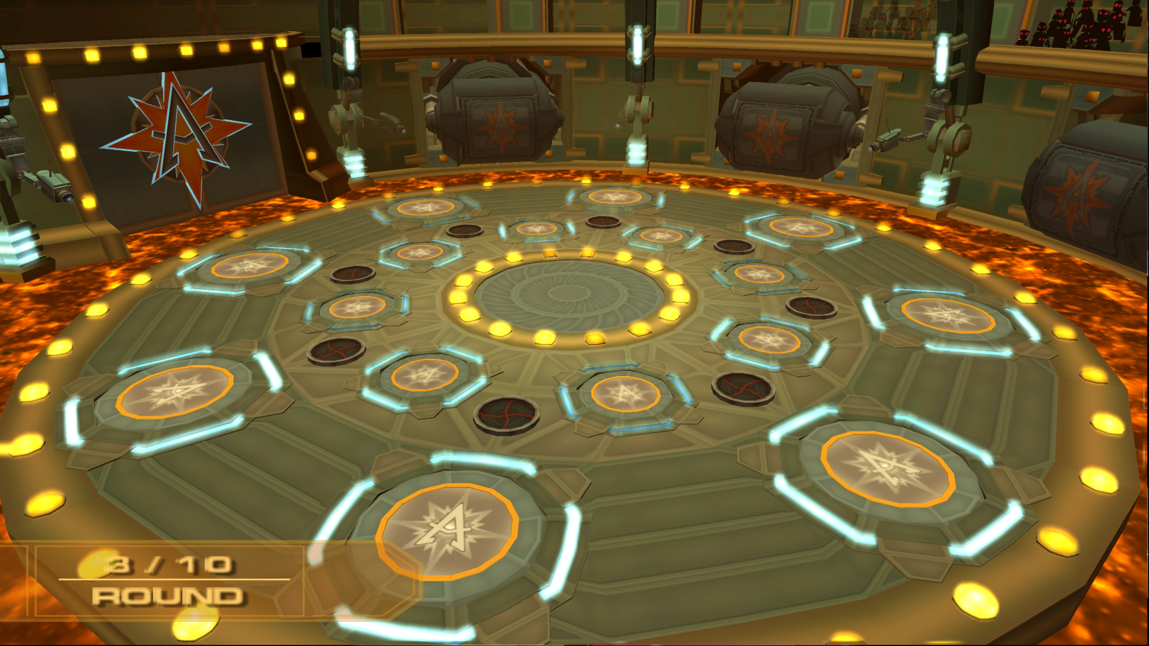 "Robot Rampage" consists of twelve rounds, in which the hazards around the arena change periodically, becoming more and more dangerous. Therefore, it becomes imperative to avoid them by watching your step and staying aware. Enemies are a mix of gladiators, laser bots, bash bots, and blade bots, and as usual, they are best defeated in clusters. The floor in the center disappears in the sixth round leaving a lava pit in the center, remaining this way for the rest of the challenge. A gatling gun will rise out of it in the tenth round, remaining for the final two rounds. In the seventh round an inferno crate will become available.