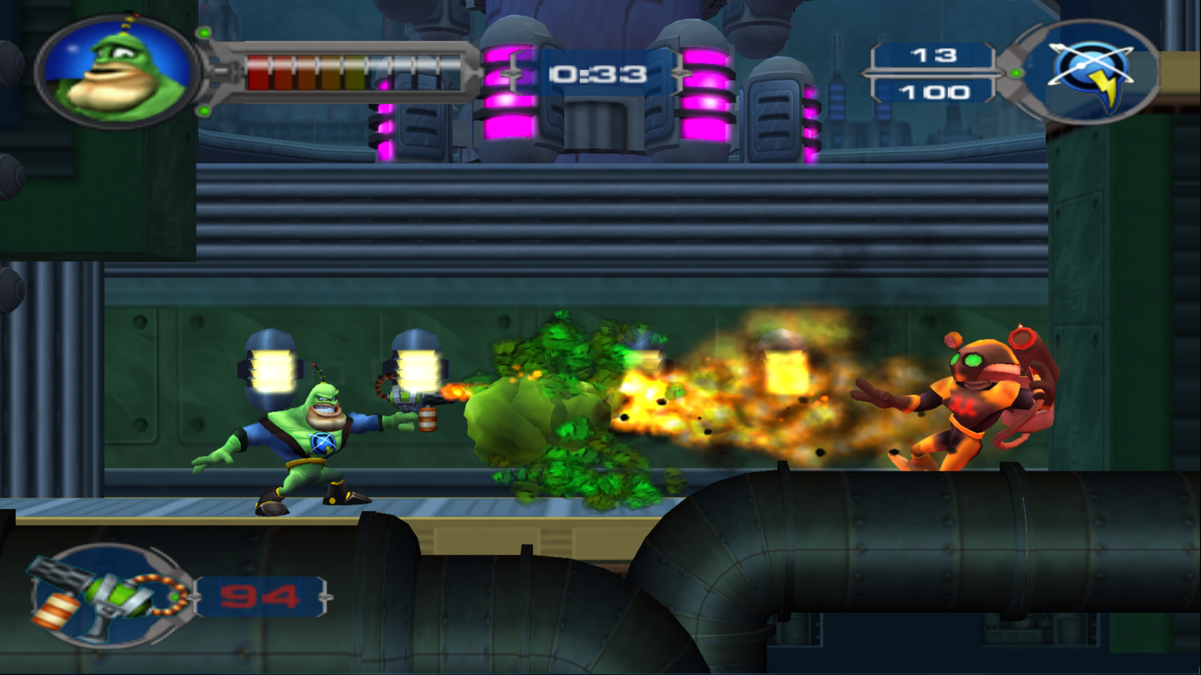 Head right when the level begins, and small amoeboids will arrive, coming from smashed windows. Punch them as you continue forward, jumping to collect the tokens. You will encounter the first extermibot here, which will charge up a ranged slime attack, which travels forwards indefinitely, when it spots you; punch it before the attack charges up, then proceed. Next up will be medium and small amoeboids; while the small amoeboids die in one hit, the medium amoeboids will split into two smaller amoeboids after taking a hit.