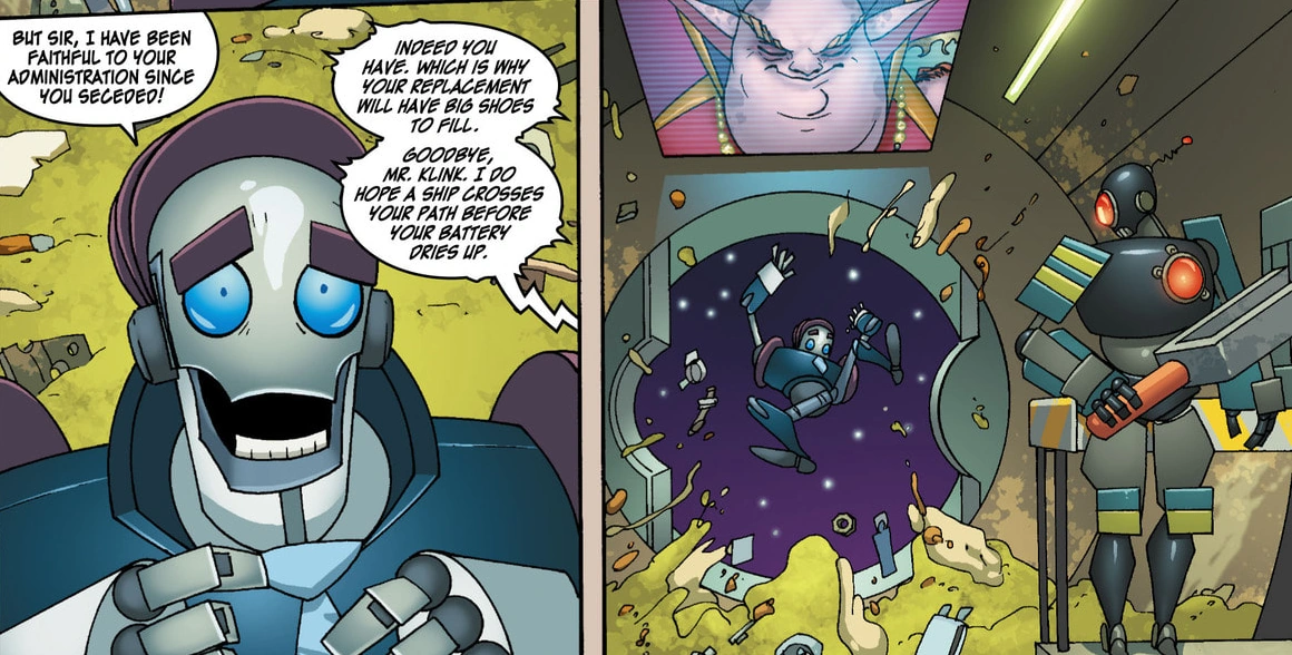 Once regarded as noble and a man of the people, Zogg's defeat in the election marked a turning point. He lost faith in democracy and in the public, ultimately transforming into a tyrant. Zogg retained the support of numerous former government loyalists, including Mr. Klink and his right-hand man Vorn Garblak. Zogg ruled his galaxy from his personal warship.