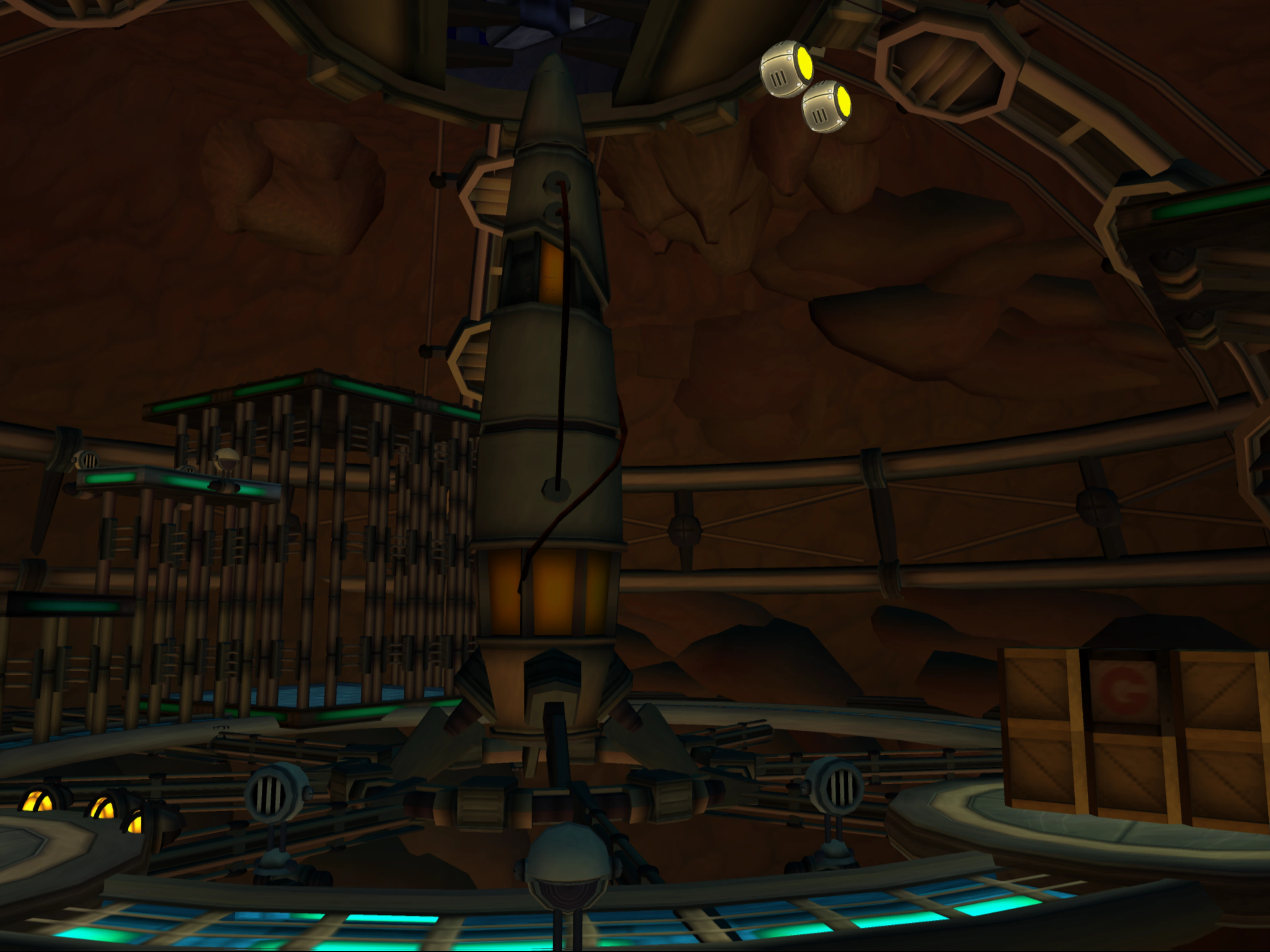 The second ship connects to a third by another refueling tube. The third is notable for being seemingly complete and containing a rather large amount of turrets on the exterior of its hull. There are four Gadge-Bots located inside, as well as a small group of alien enemies and a lone Hydrodisplacer on the bridge. Picking up the latter triggers a path to extend from the very first platform to connect to the spaceship's bridge.