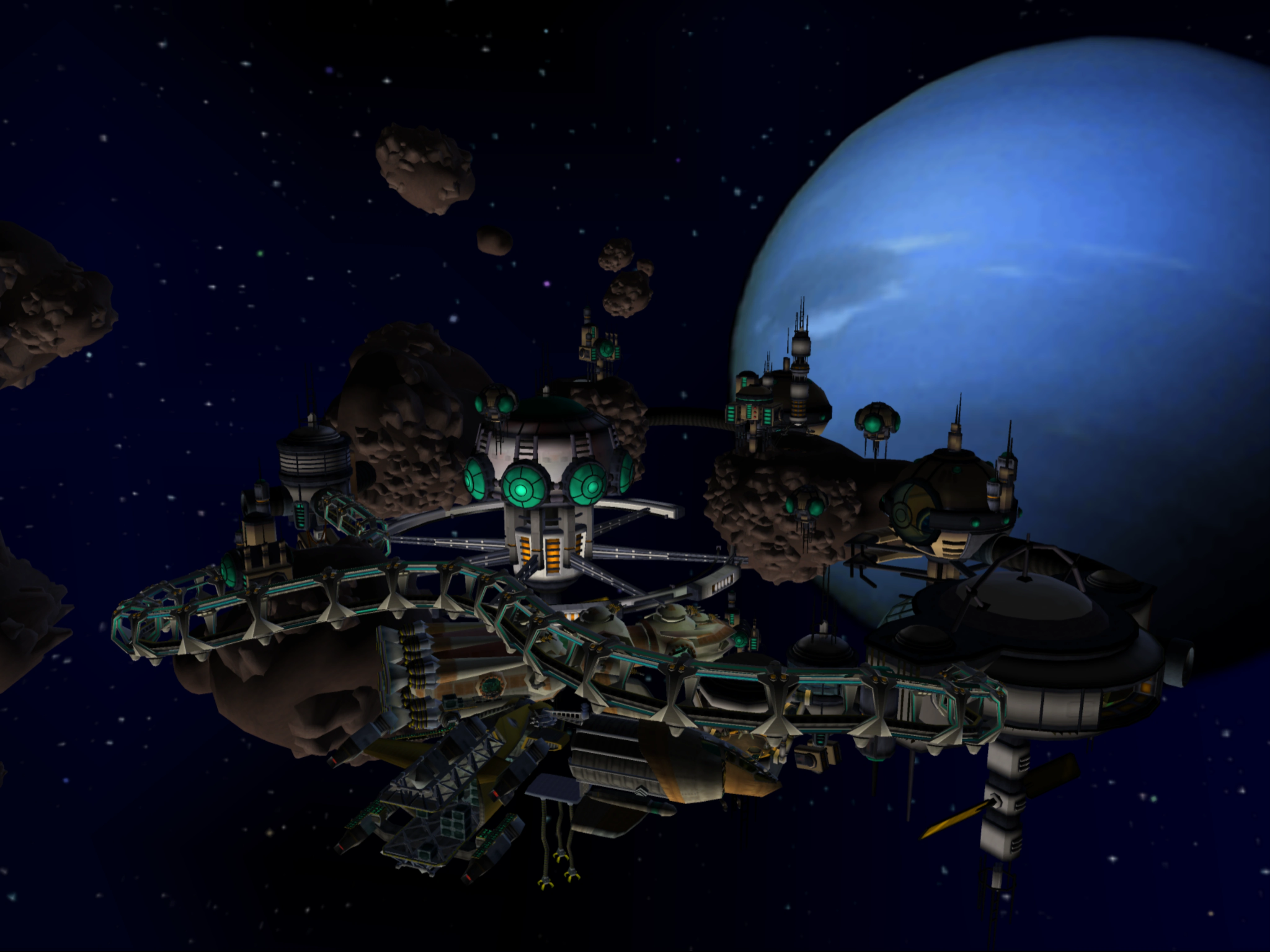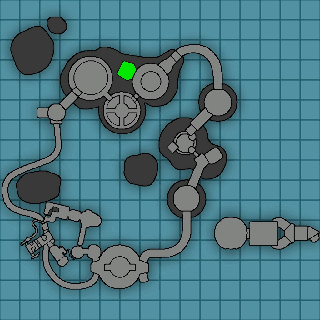 The Station is located amidst a small asteroid field, and in fact, uses several of them as housings for rooms of the station. It is effectively a loop, with the landing bay being connected to the other end of the station by a long grind rail, easily visible as the snaking glass tube. There are also several minor rooms, structures, and buildings located on the asteroids or floating nearby, though these are inaccessible.