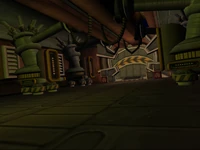 Starting at the landing bay, there is an airlock leading to three stationed spaceships, an inaccessible grind rail opposite the airlock, a shuttle that leads to the decommissioned blarg warship, and a corridor blocked by a forcefield opposite the shuttle. Said corridor is home to a small population of alien swarmers, which ambush you near the end. The corridor ends in a smaller chamber of the space station, which then leads to another forcefield-blocked and swarmer-infested tunnel. An Invinco-Locked room filled with crates is situated at the end, though a side passage leads to a larger area with a missile located prominently in the center. This room, and the previous end of the tunnel, are all located within a hollowed-out asteroid.