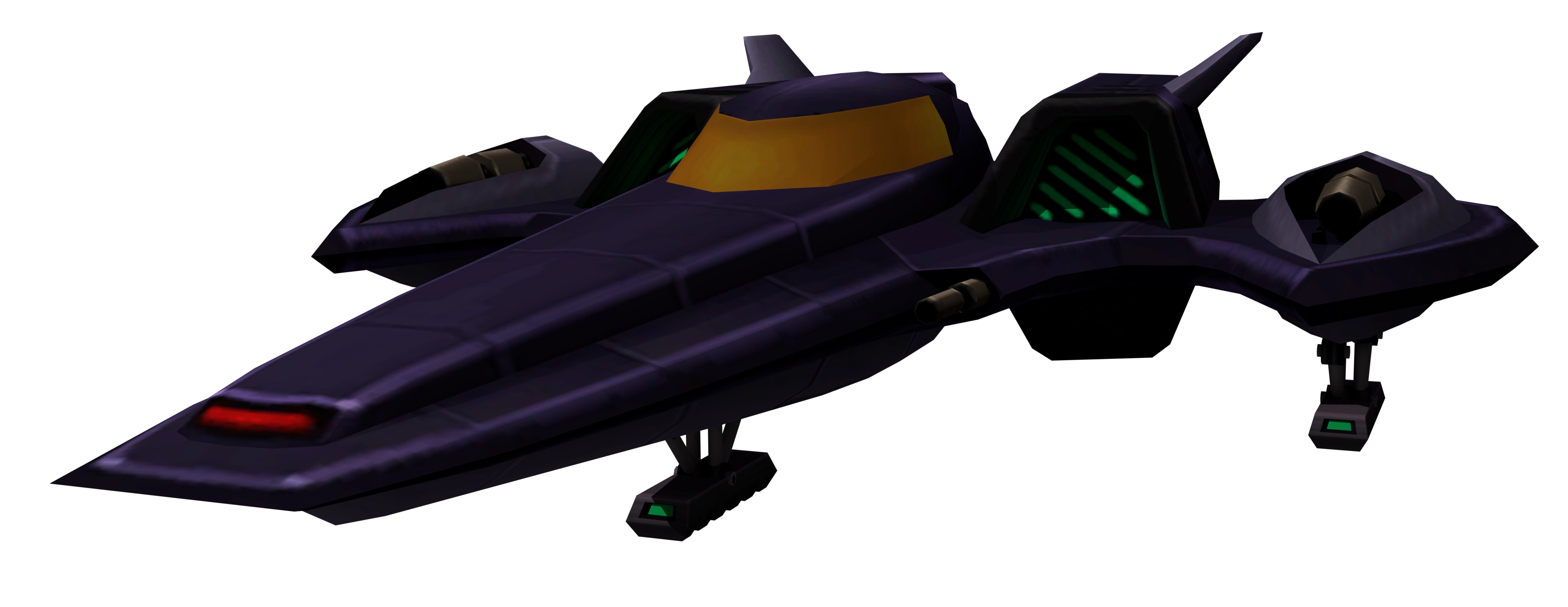 The blarg fighter is a fast ship[2] that is sleek but deadly.[1] It is a long, purple ship with a yellow cockpit, two green engines on its back, and two wide wings. The ends of each wing appear to contain gray weapons, though Ratchet and Clank do not fire any weaponry from the ship.