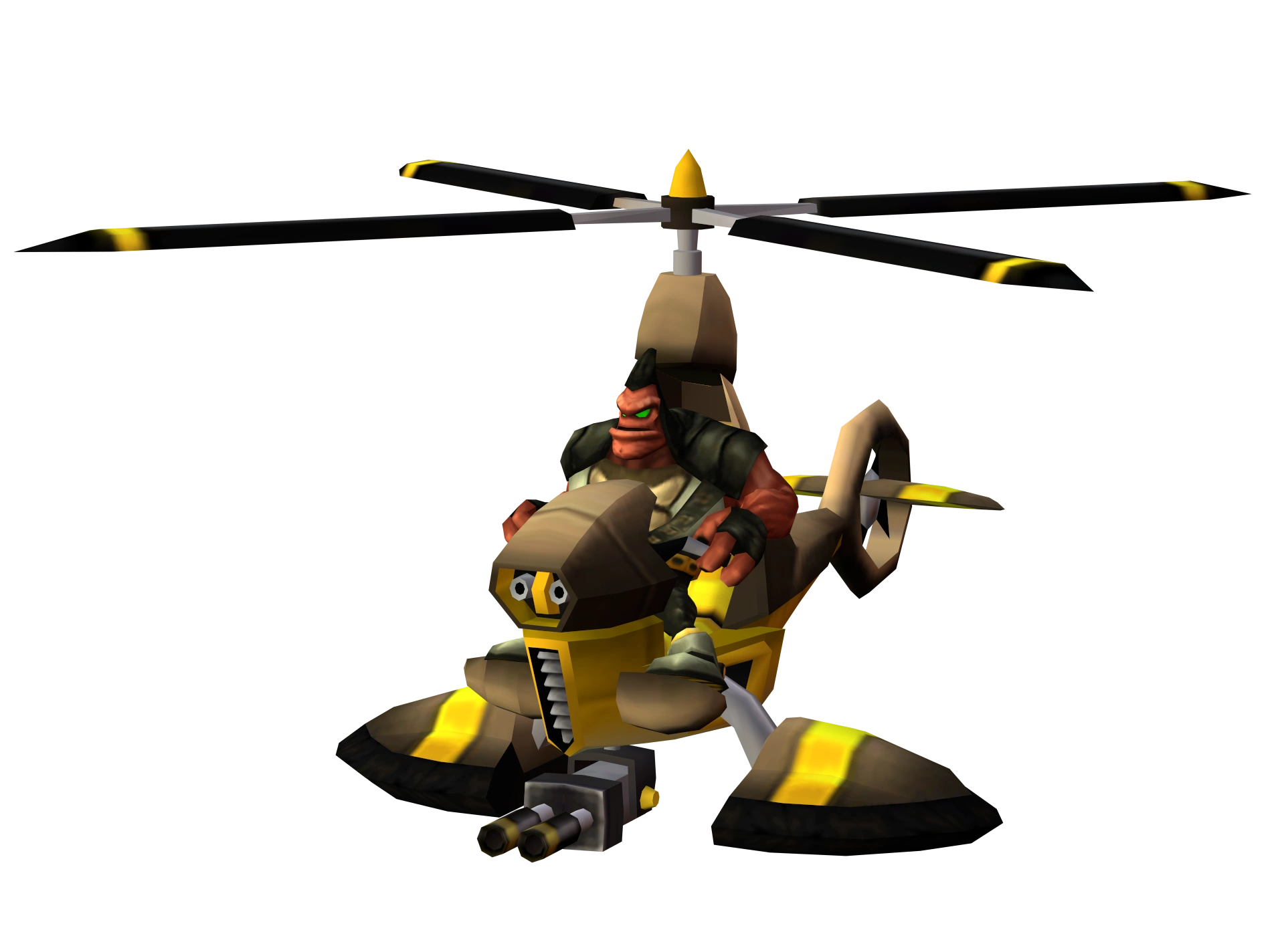 Blarg heli-commanders pilot a medium-sized yellow helicopter where the cockpit is visible. The helicopter appears to be able to fly just above the ground. They have a mounted cannon just below where the pilot sits, which fires a rapid-fire machine gun or rockets. Heli-commanders tend to appear distant from the area they are guarding until a target arrives, attempting to get a surprise attack.