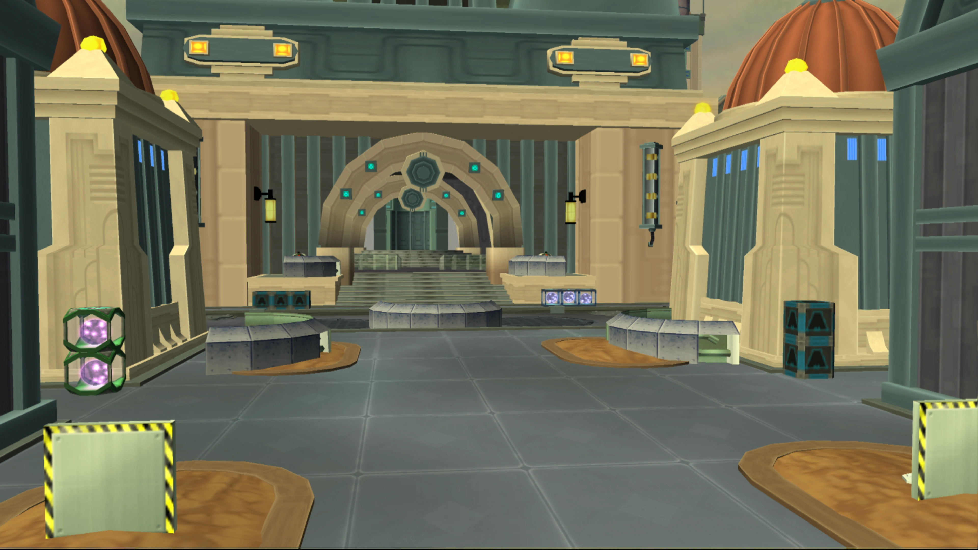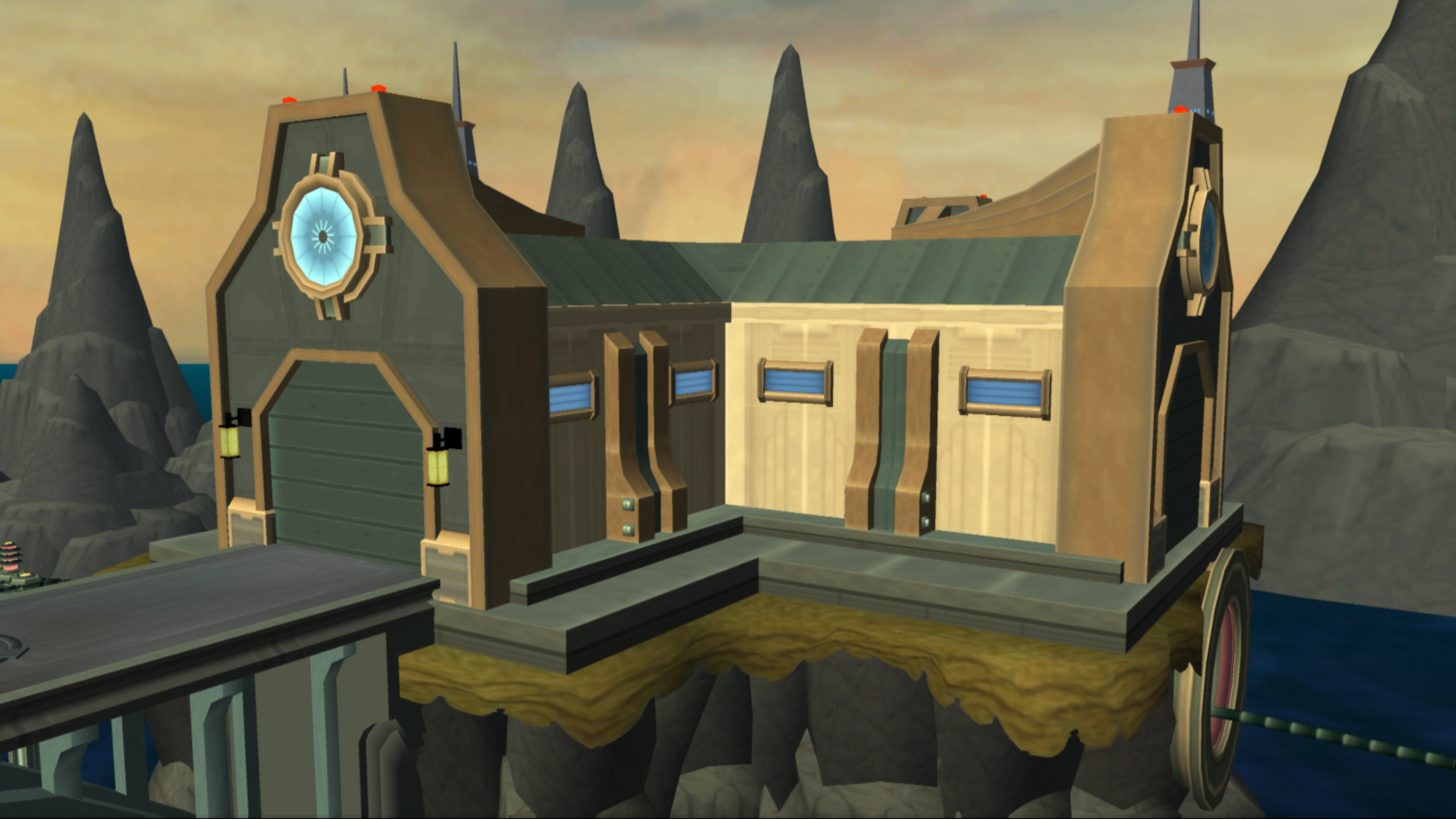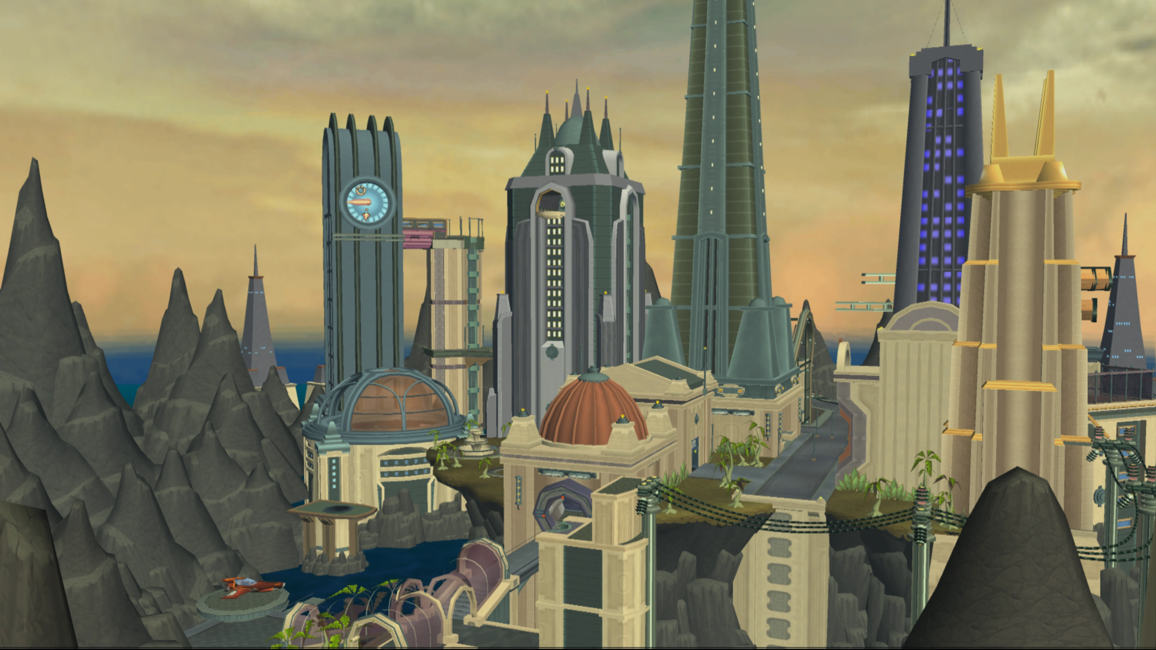 The Star Explorer lands on a tower built over rocky islands, in front of the main entrance to the Silver City. The main entrance, initially blocked by an electric force field when Ratchet landed, is a set of stairs covered by a tunnel-like glass roof. A taxi also travels to a maintenance entrance to the hyper-expressway.