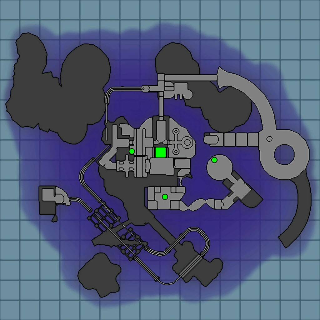 The garage is a large building signified by a tall green door with a blue circle directly above it. Concrete floors on the island surround all floors of the garage. Inside, the building has one room consisting of two corridors, one straight, and one off to the right found half-way through the first corridor room. The room has yellow lights of various shapes across the walls, but is otherwise empty aside from two teleporters on either end of the main corridor (with the teleporter on the end going to the Museum).