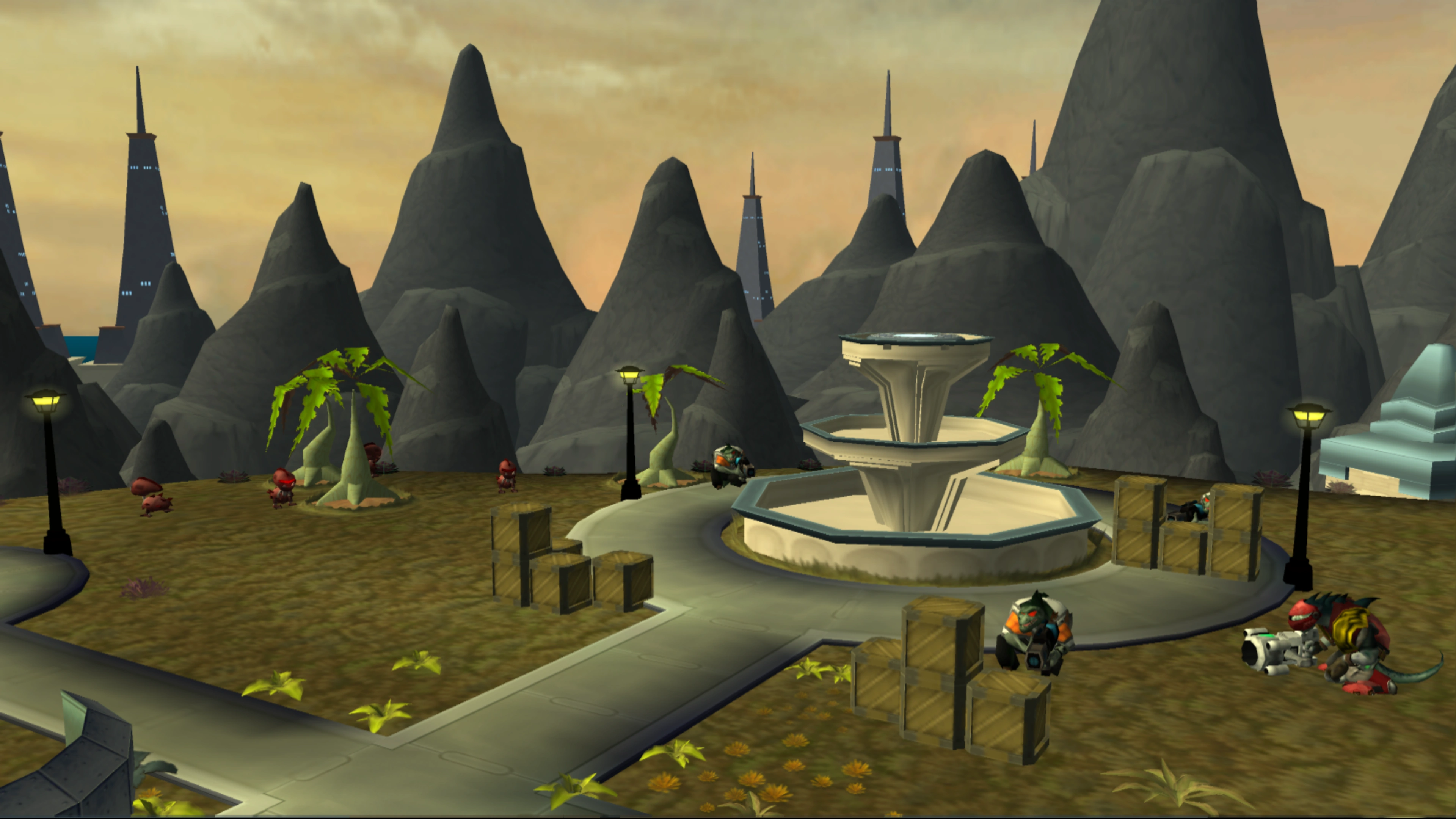 Within Silver City are simple streets usable entirely for pedestrians,[a] with several houses and street lamps either side. Many of these streets are blocked off from one another by thick, translucent walls. Nearby, and sometimes alongside, the streets are small patches of vegetated land, as well as water fountains, one of which is located adjacent to the city's main entrance and contains a teleporter to the Insomniac Museum garage. To navigate the city, grav-ramps provide a means to traverse otherwise inaccessible paths around the streets and between the larger buildings. One of these grav-ramps is a corkscrew structure, and connects two towers,