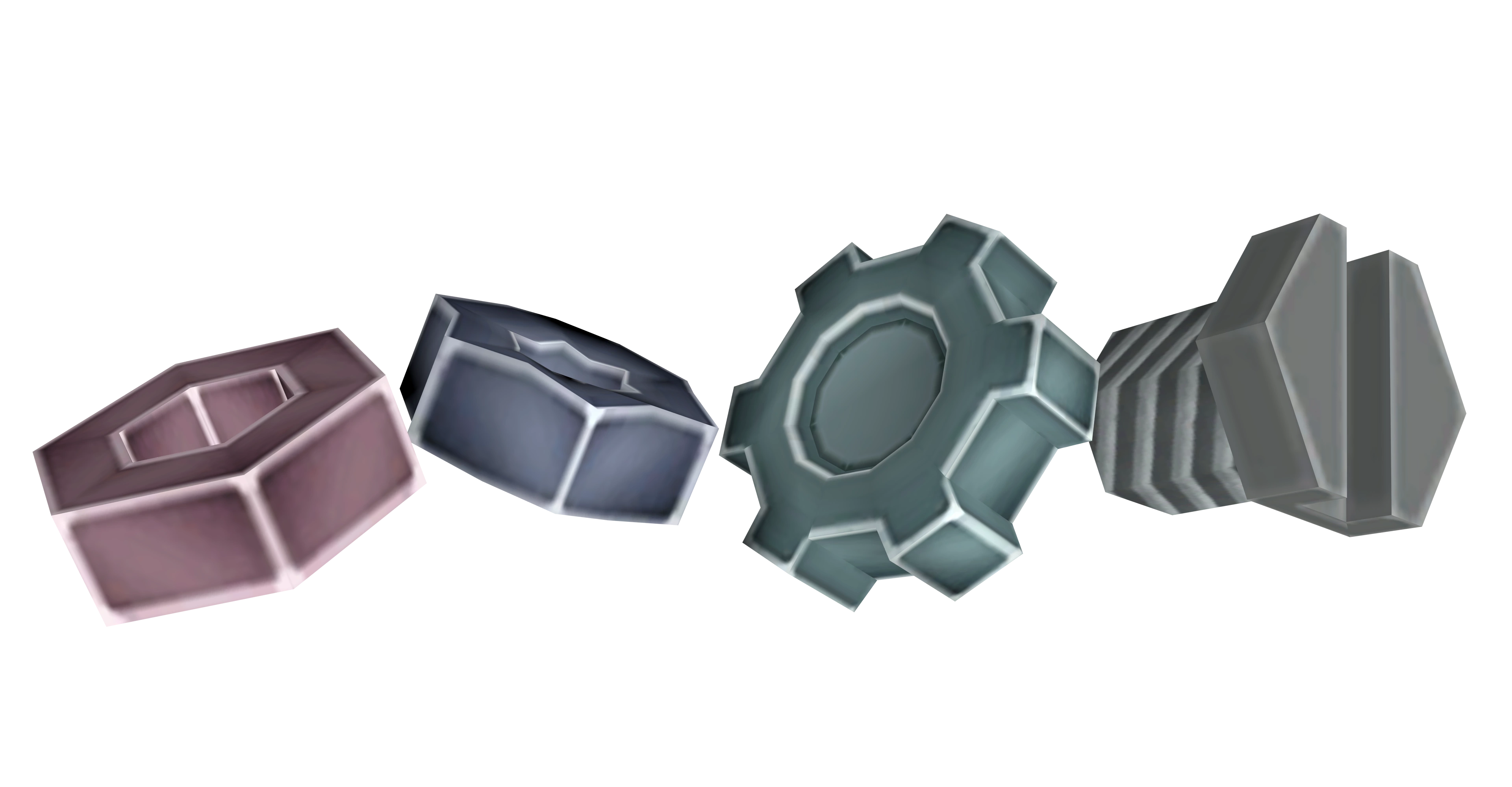 Bolts in Ratchet & Clank. From left to right, a hex nut, a star nut, a solid gear, and a hex bolt.