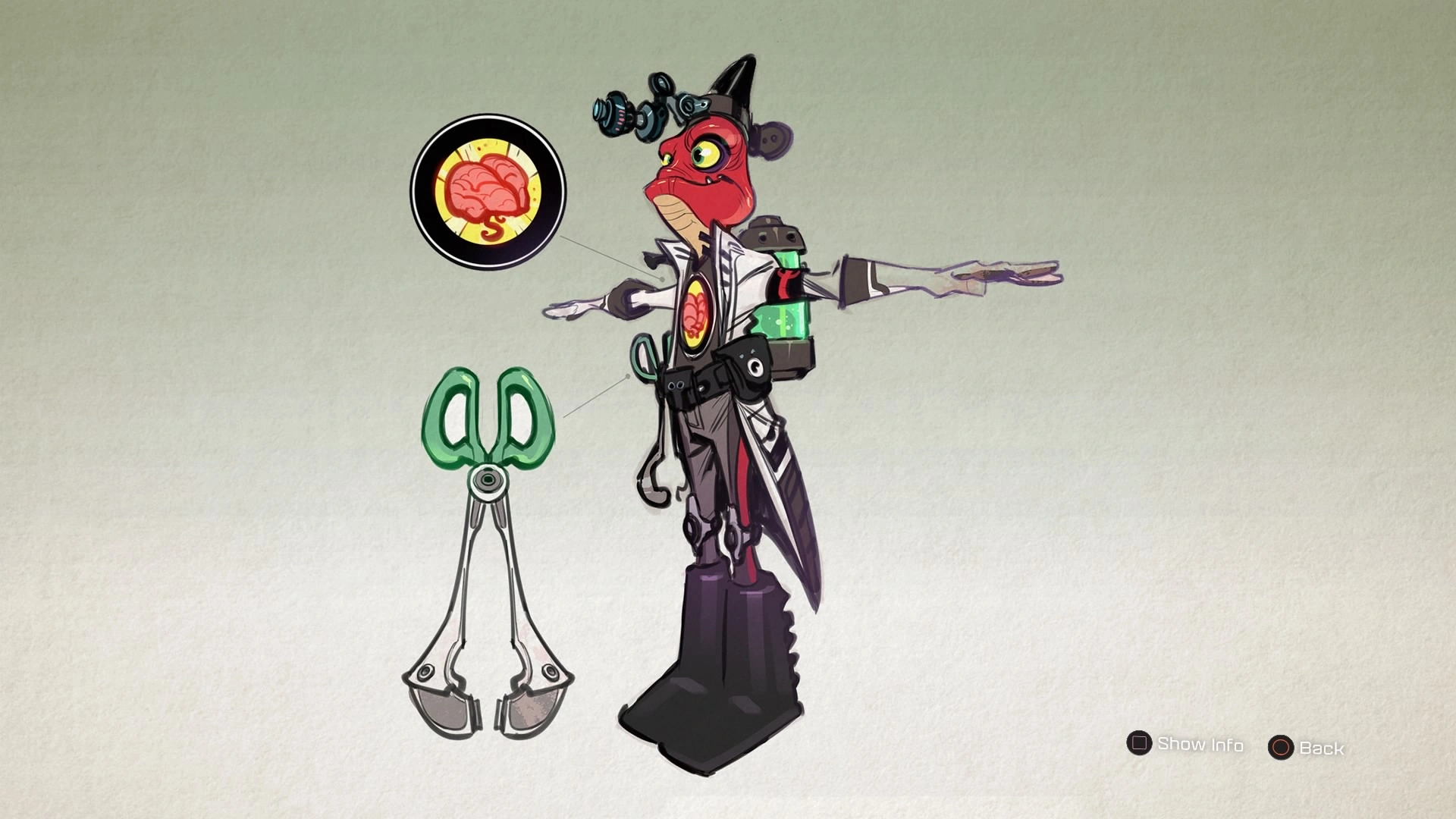 He is a blarg who wears a white lab coat, a shirt with a brain image, a red telescope helmet, and a backpack holding two green canisters of green liquid.