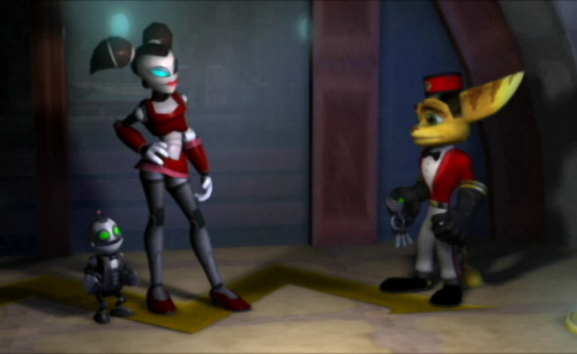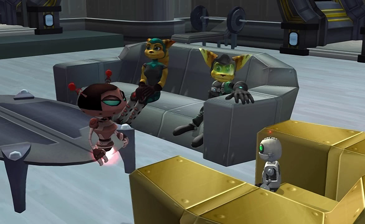 Clank with Ratchet, Angela, and his admirer in his apartment on Endako.