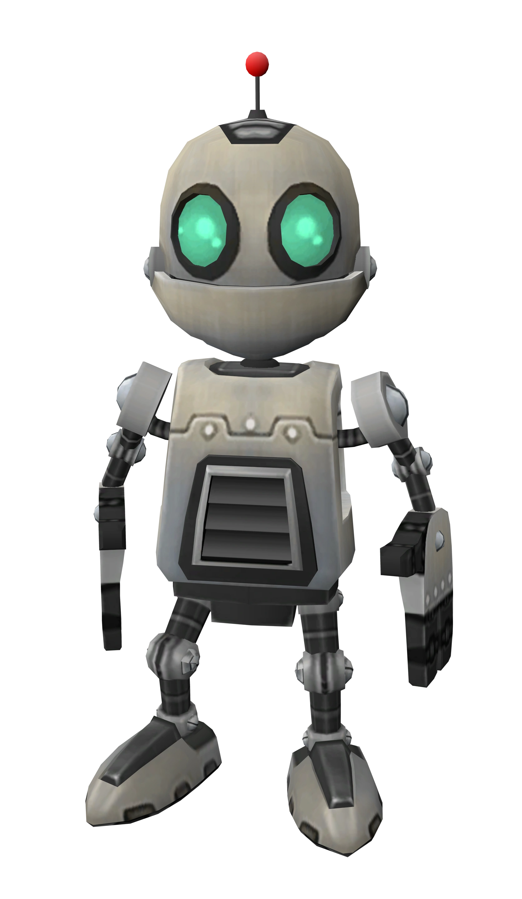 Clank is a diminutive robot with grey metallic skin made of titanium alloy,[24] large green circular eyes, a red antenna, and small articulated arms and legs with large three-fingered hands and feet. Clank contains what appears to be an air vent on his chest, which is actually used to store items.