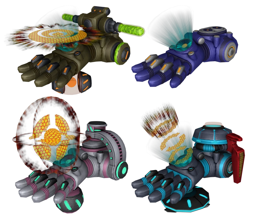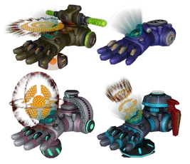 The Constructo Bomb is a metallic glove that holds the bomb on its palm. Its appearance changes depending on which components are equipped. The type of payload is displayed via a hologram on the top side of the glove.