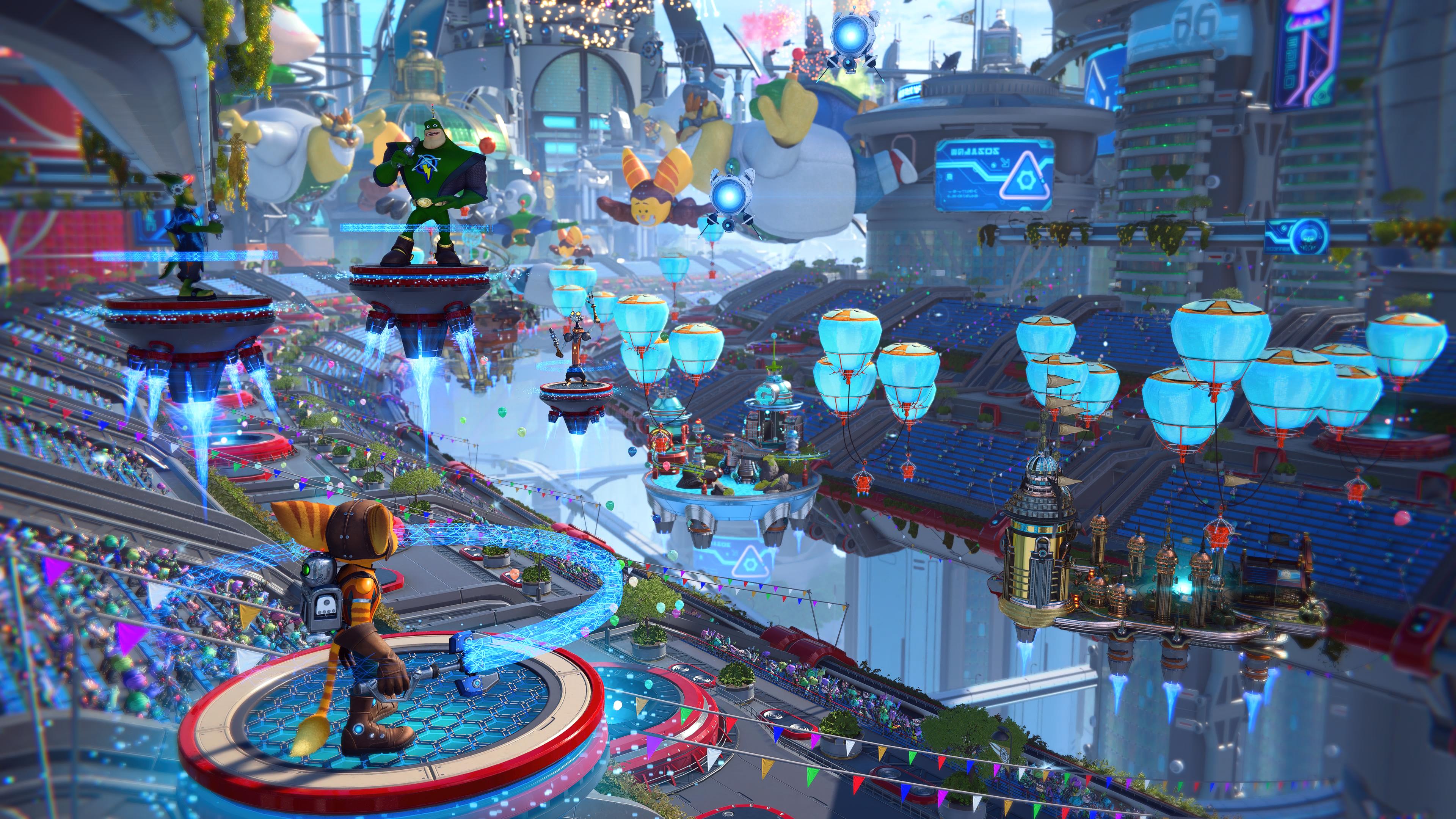 It is here that Captain Qwark organizes the Festival of Heroes to celebrate the past heroic accomplishments of Ratchet, Clank and of course himself. The festival is hosted by Qwark himself, along with Ratchet and Clank's old Q-Force ally; Skidd McMarx and their enemy turned acquaintance, space pirate; Rusty Pete. The festival is soon interrupted however by the recently rebranded Goons-4-Less, attempting to assassinate Ratchet and Clank under orders from Dr. Nefarious. Clank had rebuilt the broken Dimensionator from the duo's previous adventure and was planning on gifting it to Ratchet so he may find his lost race; the Lombaxes, in another dimension. Nefarious stole the Dimensionator during this and was pursued throughout the city. During this, the duo ran into Mrs. Zurkon at her vendor and purchased a new weapon to help in their fight against Nefarious and the goons. The Doctor confronts the two at the train station and attempts to use the device against them, however, Ratchet impulsively shoots its Phase Quartz power core and damages it, causing the dimensions themselves to begin unraveling, leading the Dimensionator to become more and more unstable and sending Nefarious flying in an explosion into a nearby building. After making their way through the sky train station and a taxi stand, Ratchet and Clank catch back up to Nefarious at the gardens area and battle him in his Party Crasher mech. Before he can be defeated however, he opens a rift before the Dimensionator eventually explodes to bring Ratchet and Clank with him to a dimension where he always wins.