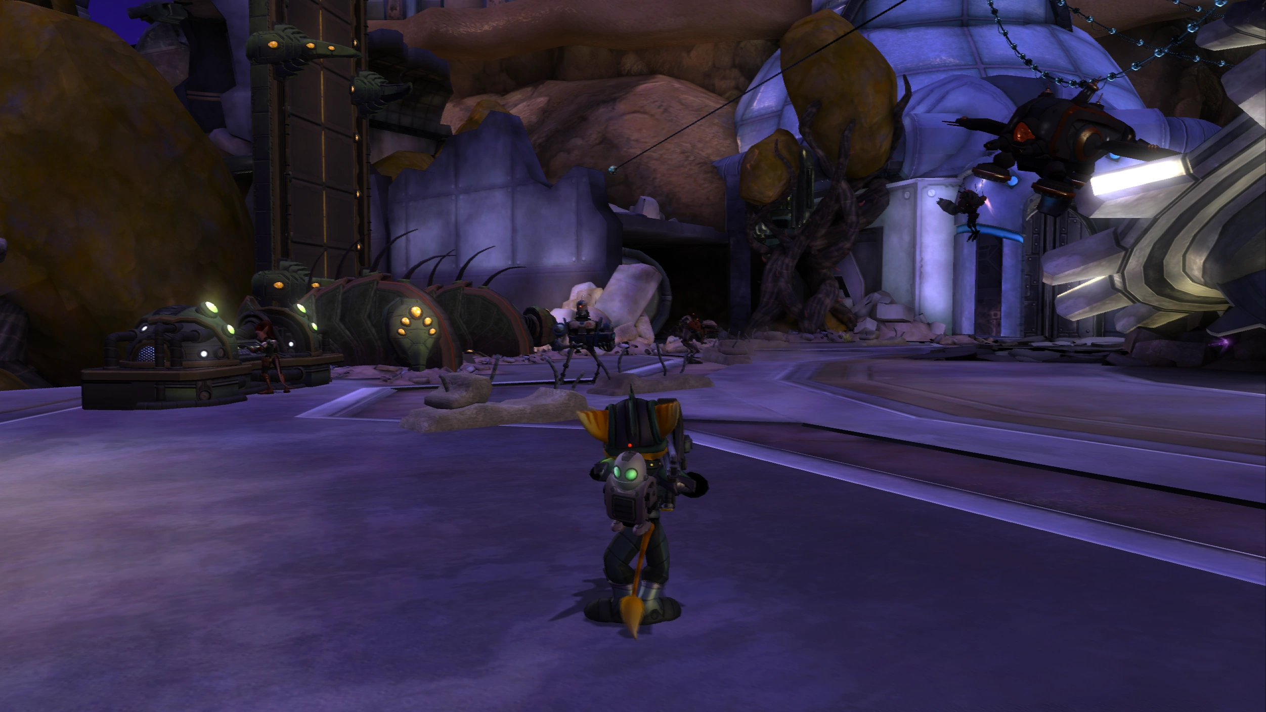 Cover Talwyn and Enter the Court of Azimuth are missions in Tools of Destruction, taking place in the lombax ruins on Fastoon. After destroying the Magna-Cannons, Talwyn Apogee was able to land her ship and needed support to be able to hack the bridge controls so that Ratchet, Clank, Cronk, and Zephyr could proceed further into the ruins.