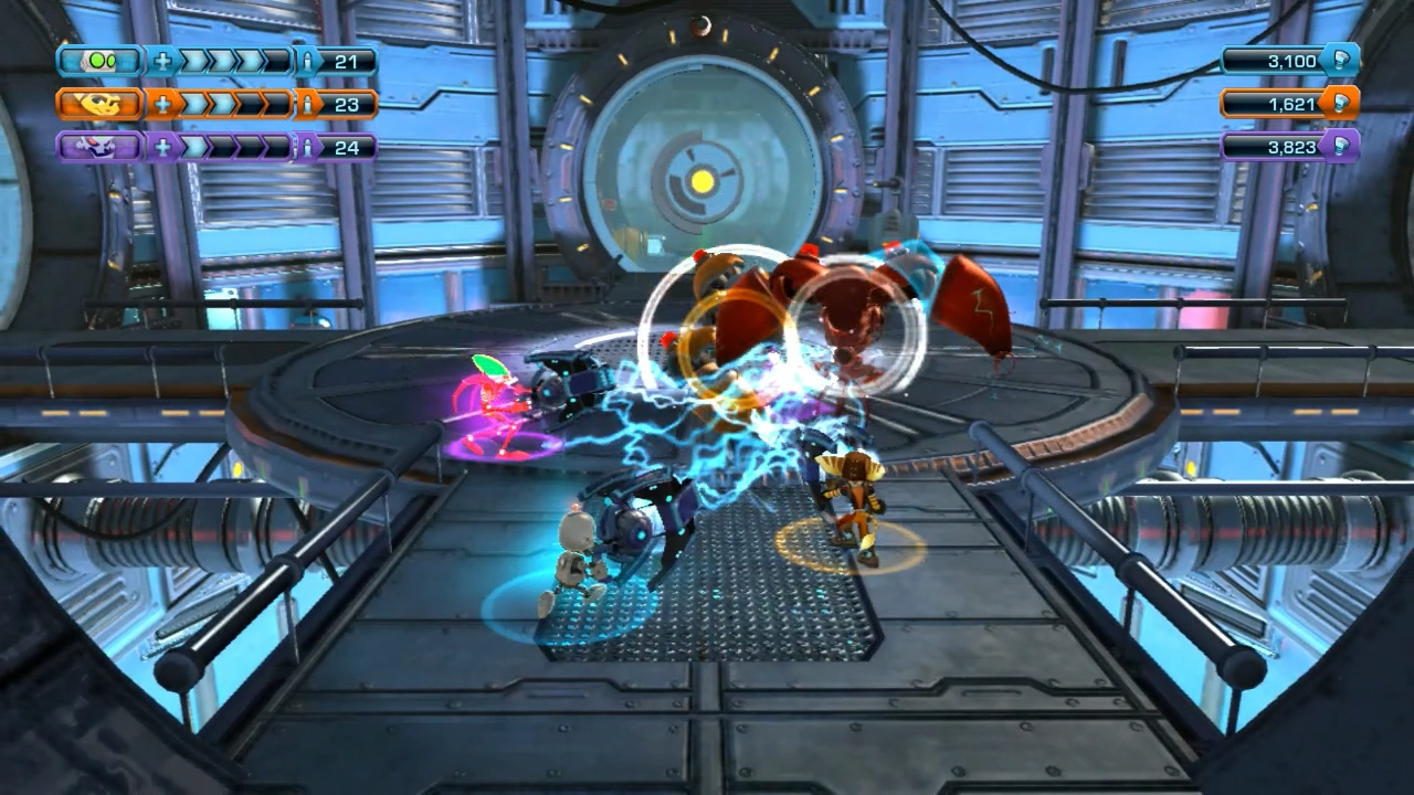 The Darkstar Fission Tether is first available at the Rehabitation Center segment of N.E.S.T. for 15,000 bolts, with additional upgrades unlocking at the Cove segment of Octonok Cay. It is not upgraded through use, but its ammo can be upgraded for 10,000 bolts and its power for 25,000 bolts, increasing both range and damage. After purchasing the ammo and power upgrades, the elite version can be obtained for 60,000 bolts, which generates an electrical shield around the user when active, protecting them from close-quarters enemy attacks.