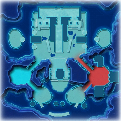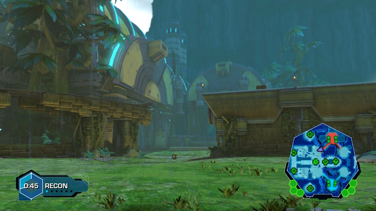 The competitive multiplayer map on Ebaro has a somewhat lopsided design, where the bases are positioned relatively close together. One side of the map features two large, open islands connected by both a winding hoverboots passage, and another island hosting node 7. Node 7 is guarded by a Missile Minion, and sits directly between the opposing bases. On the other side of node 7 and a tall structure is node 2, the only other node in the central area.