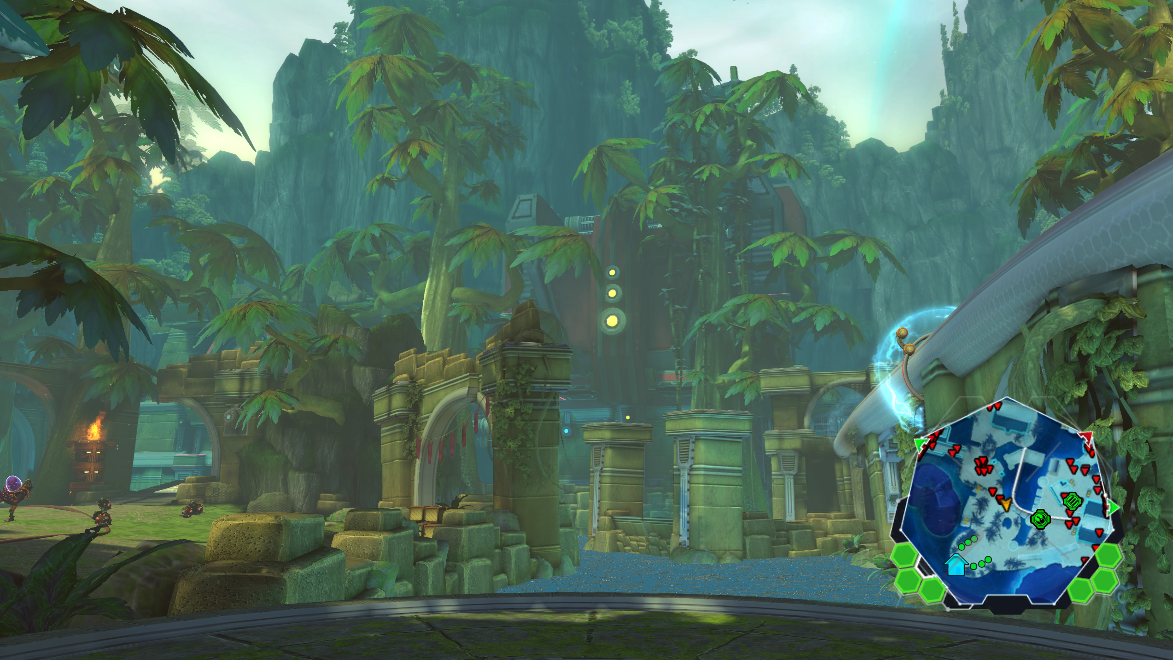 The opposite end of the map is dominated by a large temple complex containing nodes 4 and 5. This area can be accessed via steps leading into the temple, or more quickly via high roads from node 2 using the hoverboots. The temple area hides numerous bolt crates: some are next to the steps amidst flame traps, more are atop nearby pillars, and the largest stack is under a forcefield guarded by a grungarian bomber. This bomber also protects a trapped passage leading to node 1, which offers a commanding view over most of the map.