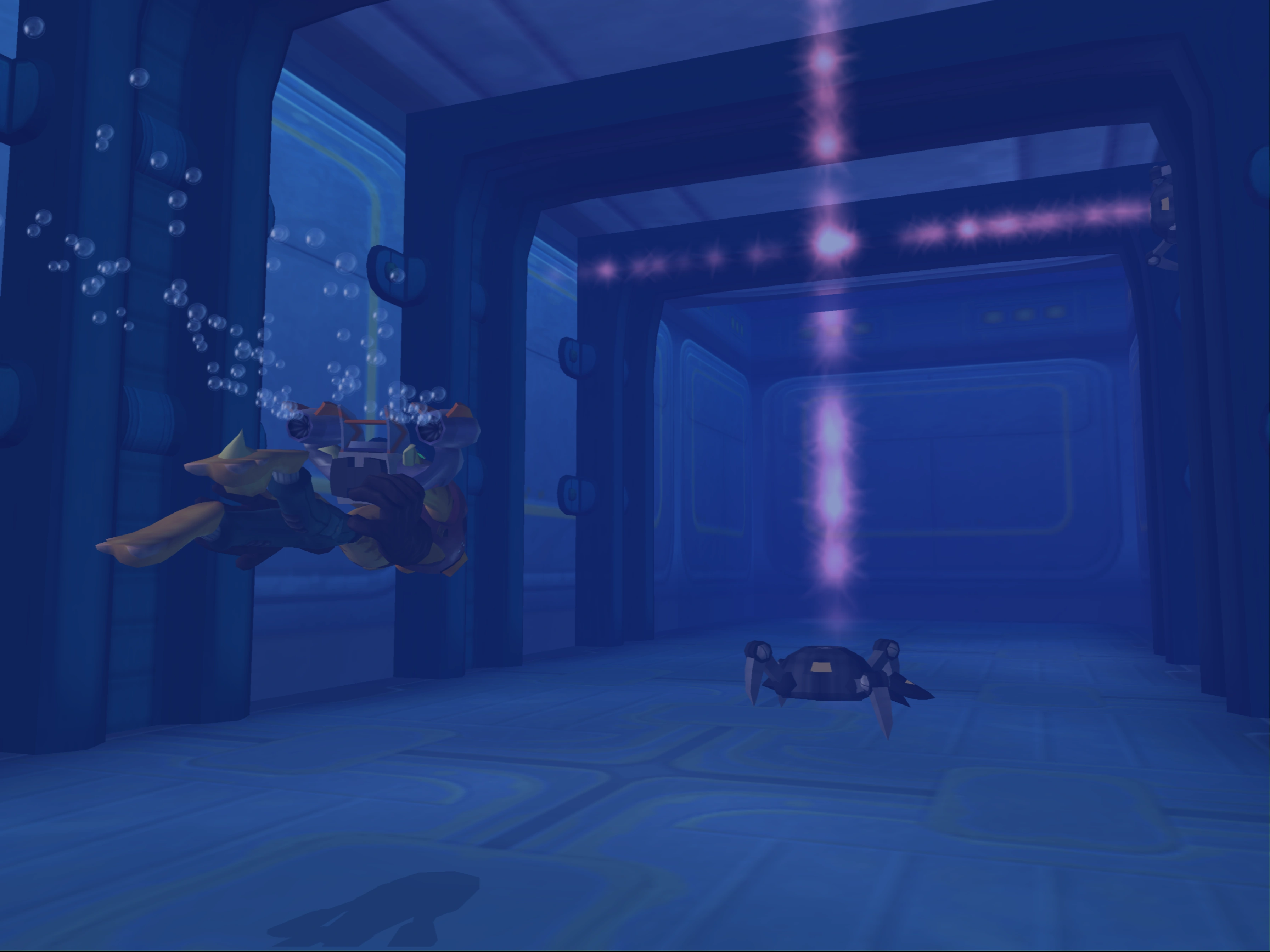 ) to use the Hydro-Pack. You must use it to activate three rings in quick succession to open the gate to the next area, swimming past a few defensive robots identical to spiderbots, except equipped with lasers.