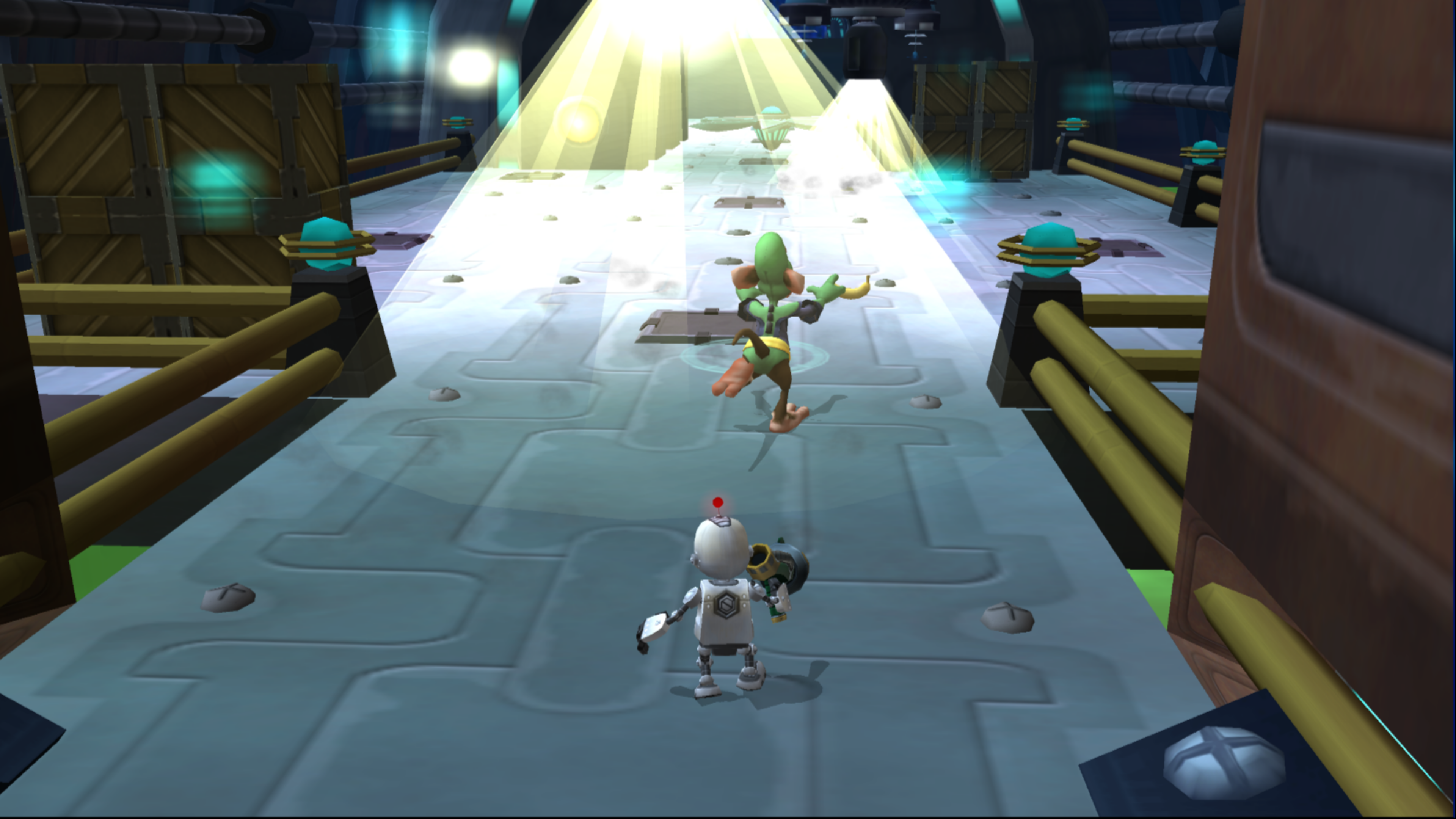 Cross the bridge and jump over the lasers to find another bridge, with a forcefield blocking your path. Fire a banana on the switch, then head to the other side of the forcefield while Skrunch has deactivated it, then stand on the next switch and fire a banana nearby to get you and Skrunch across safely. After this, head down the corridor on the right to pick up gadgebots, small robots that Clank can command by holding and selecting a command. In this case, head back to the main hallway before and select the "Attack" command to send the gadgebots to destroy the bladed spinning top blocking your path; this will destroy the gadgebot that does so, so go back to the previous room and select "Follow" for them to all follow you.