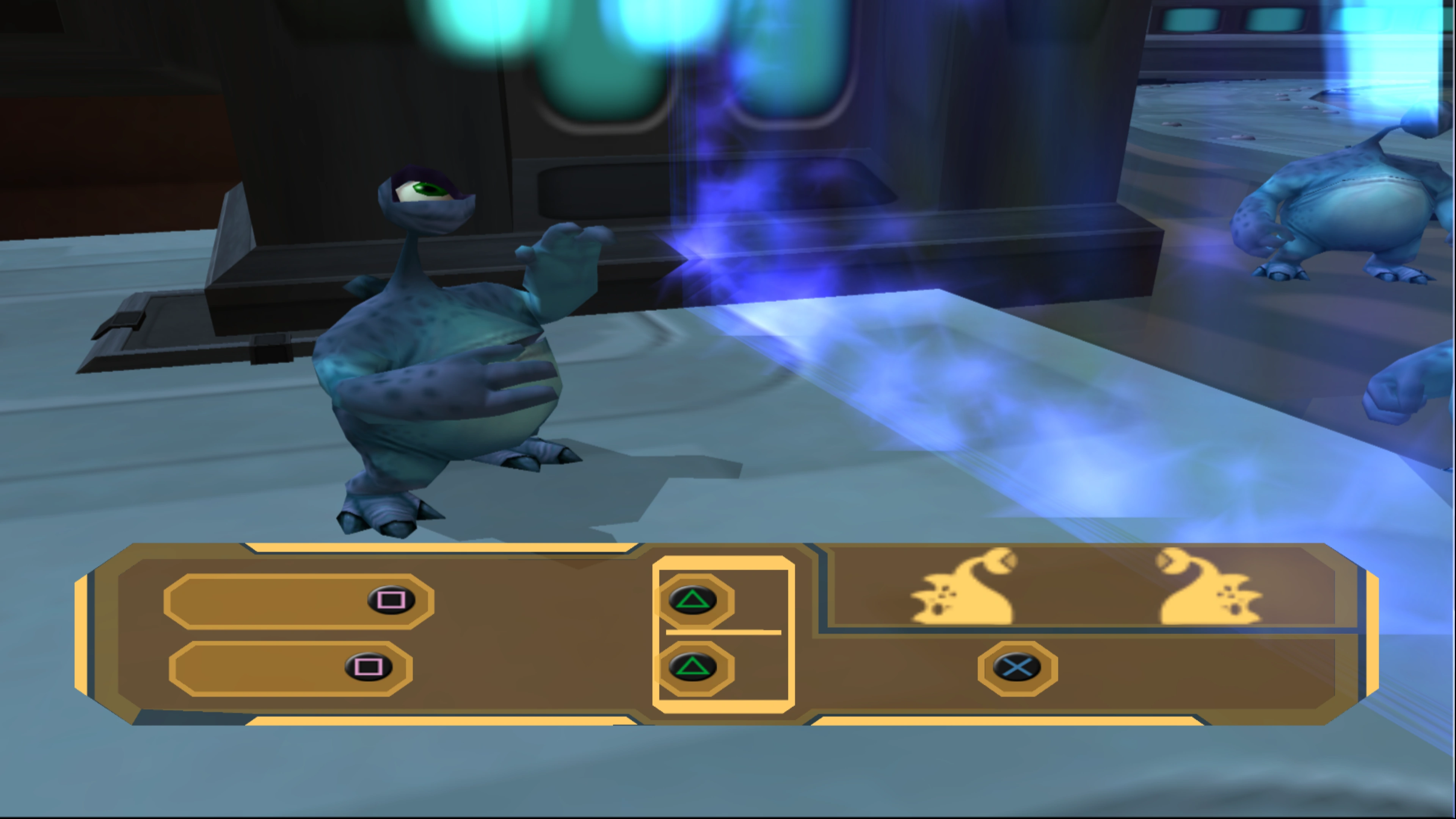 The first Ratchet section opens with a force field guarded by a one-eyed tyhrranoid. Walk over to the tyhrranoid and press to begin dialogue with them. The dialogue is a rhythm game, in which you have to press the buttons that appear on screen as they appear to pass. Note that if you exit your disguise at any time, the defenses will instantly kill you. Complete the conversation, and then head forward, jumping across the platforms, and then initiate dialogue with the next tyhrranoid. As before, press the buttons that appear on screen, though when a button appears in a long bar, hold the button down for the length of the bar. You will need to complete two conversations to be allowed past.