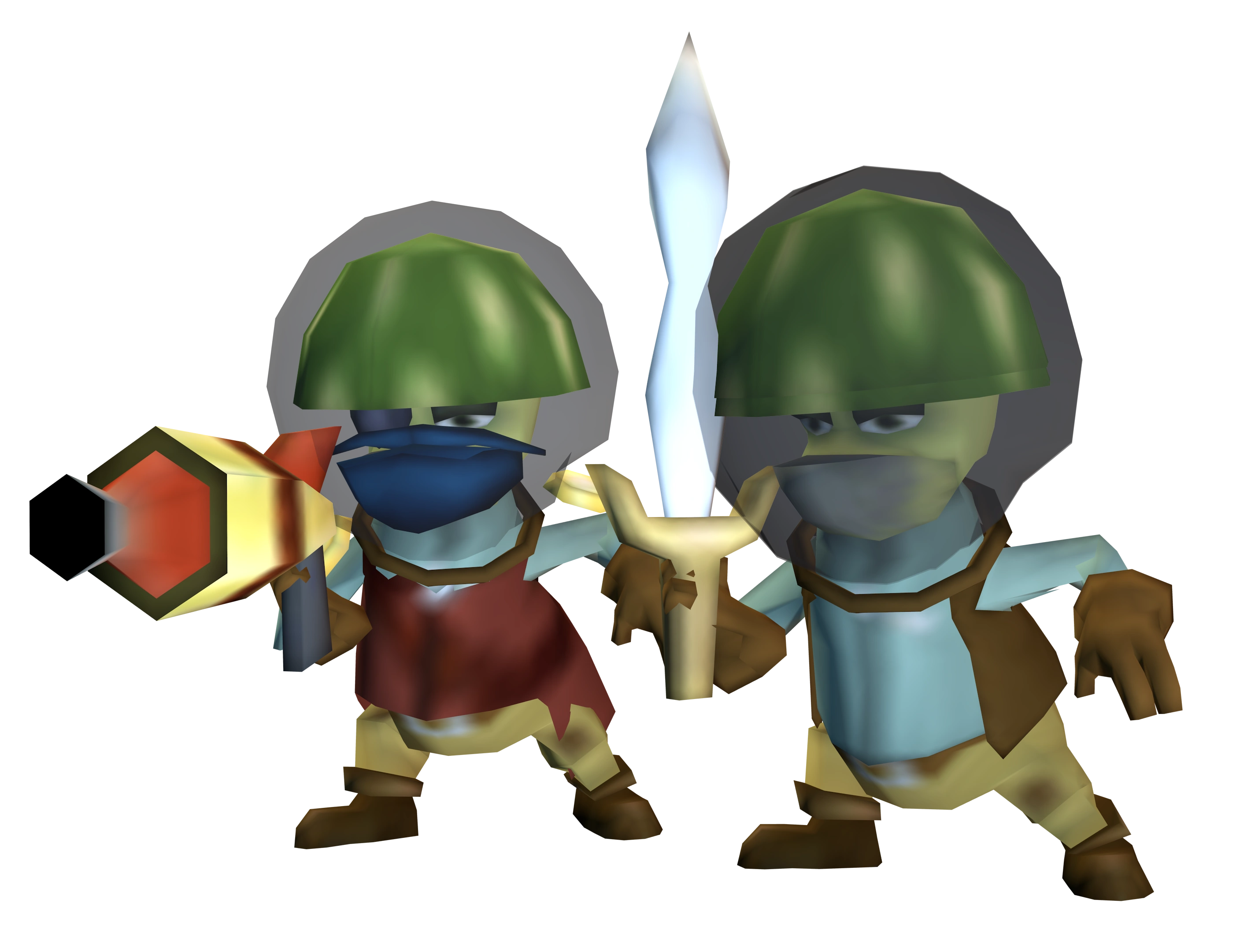 There are two types of fungal pirates faced during "Qwarkography, Ch. 4"; sword wielding and gun toting, though the pirates also attacked by operating cannons they had set up on the kudzu. Both versions of fungal pirate are able to travel around inside parts of the kudzu's body, as they would occasionally jump out of vents on it. Qwark's fists can easily eliminate any pirate in a single hit, although those carrying pistols are prone to accidentally killing their own when they block their own line of fire.