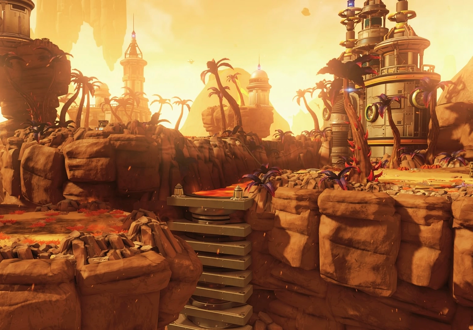 Throughout the fields, several blarg structures can be found on the islands, in the lava, and constructed on top of the large, rocky mountains found between the islands. These primarily consist of large spires with domes and antennae on their tops, often with circular platforms mounted on them, located either on top of the islands, or on top of metal plateaus constructed in between. A large assortment of wide pipes can be seen connecting several islands, many of which lead down through the lava. Jetpack fueling stations are found both on islands and on the metal structures, and the Brain Scientists' telepathopus traps can be found throughout, with tripad buttons to unlock them. A few gun turrets appear on some buildings. Despite moving, they do not attack Ratchet.