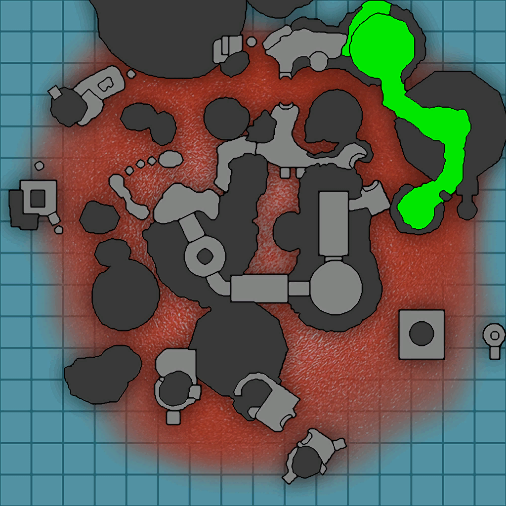 The tunnel is known to the blarg forces, as made apparent by the large number of blarg forces present inside. There are also several large structural support equipment devices set up along the cave walls, as well as plain in the center of the path, to support the weight of the lava above. Said lava also appears in a more molten form, though still red-hot, appearing as massive pillars that reach from the ceiling to the floor in two of the larger chambers. At the very end is an elevator that leads to a ridge with a gold bolt, and connects to the plateau that forms the starting area.
