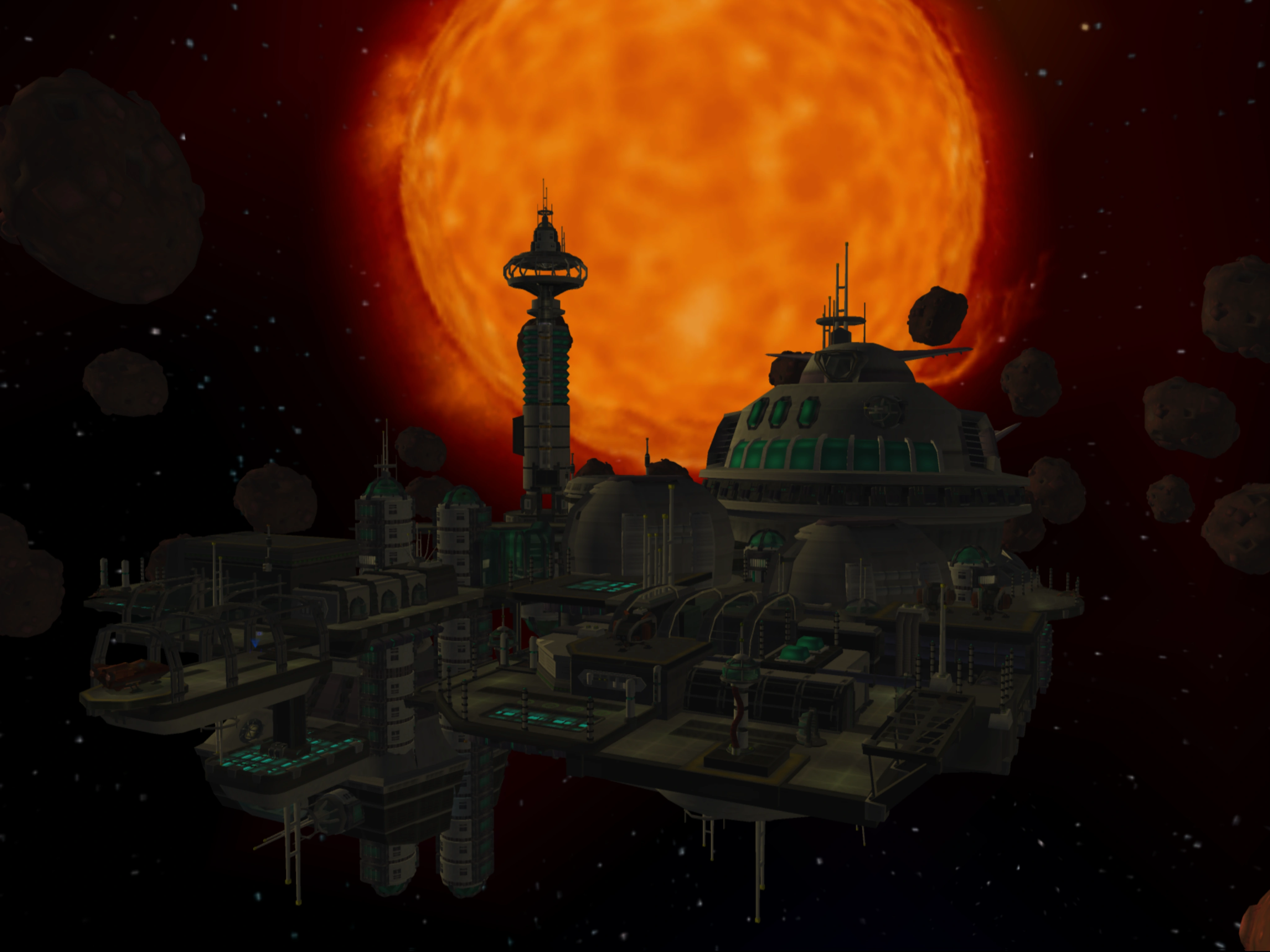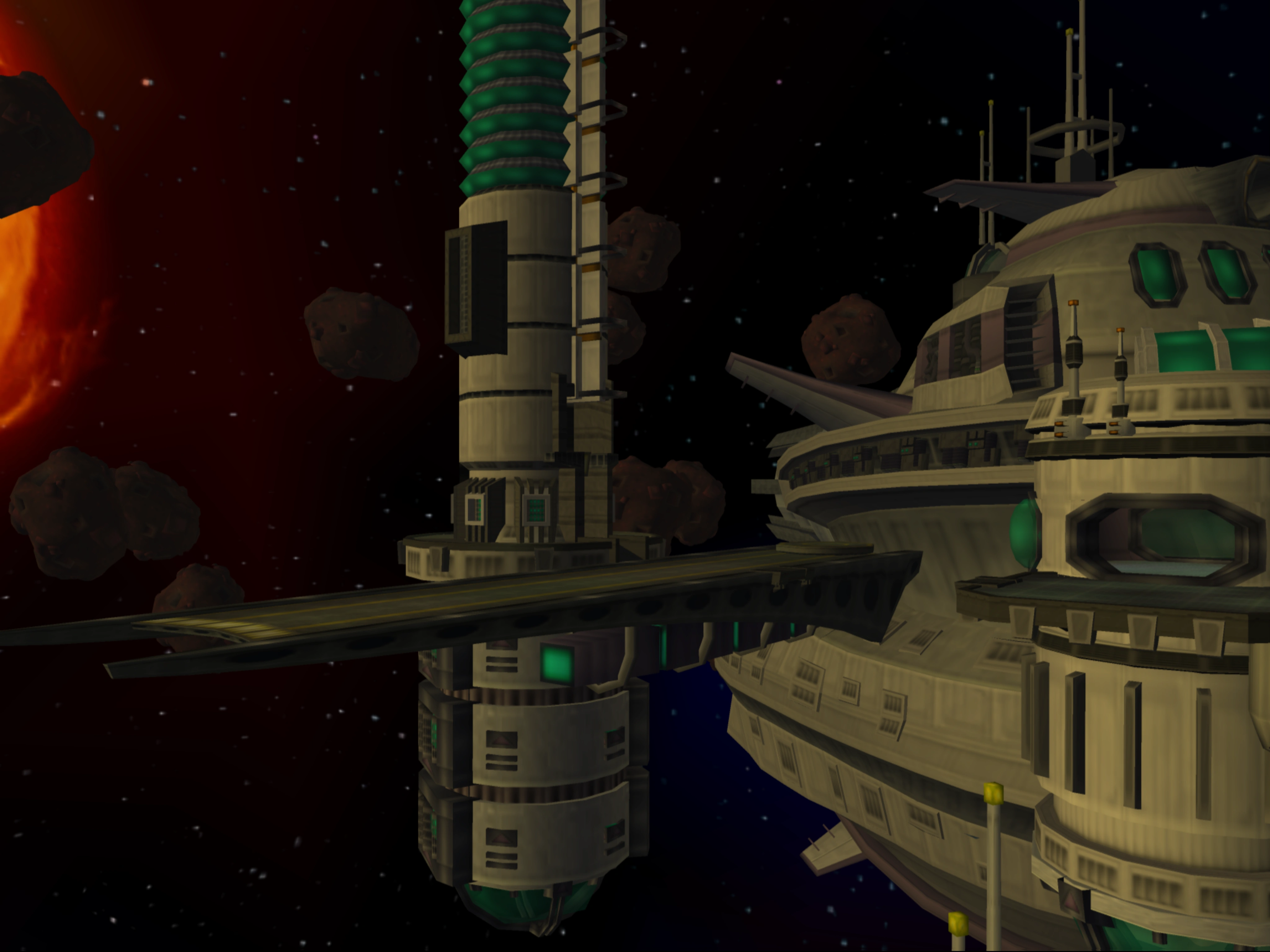 Gemlik Base is a large hunk of metal, located in the midst of an expansive asteroid field and floating in orbit of Oltanis. The base is mobile, as it has a large ship connected to its north side, complete with a bridge and three very big thrusters. It has been designed as a launch platform for planetary assaults, supporting numerous transport ships, launch bays, and a conventional landing strip for spaceships. However, it also doubles as a fortress, with defensive emplacements such as forcefields, turrets, and a group of blarg space fighters for hostile ships.