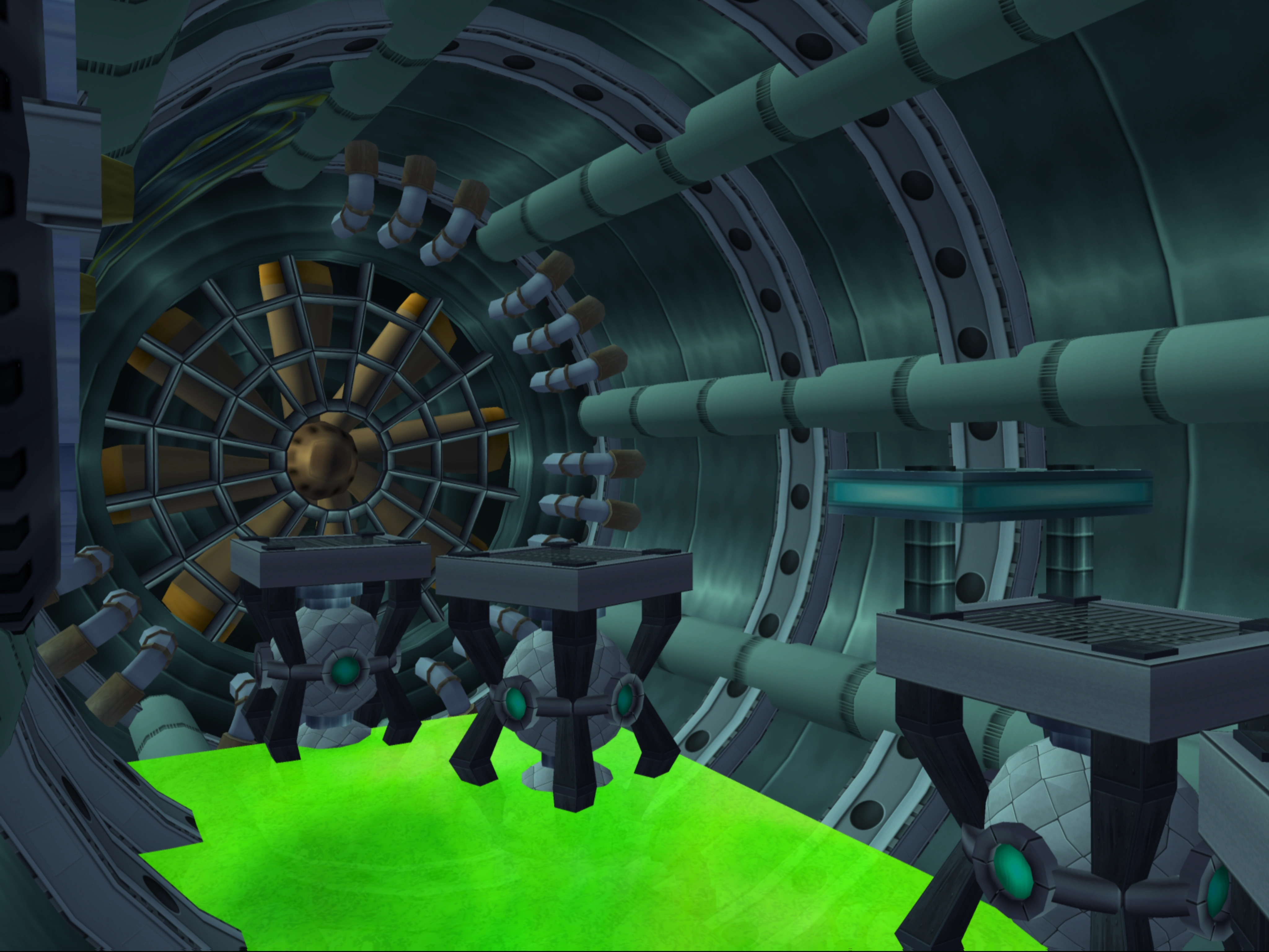 The first room is split in two by a large moat filled with green acid, with a doorway placed in the far right corner. The second room is completely filled with acid, which rises and sinks at set intervals, revealing a series of platforms at times. Another doorway is located at the end, though there is another path hidden in the bend, which leads to a separate room with a gold bolt. This room, however, is blocked by a forcefield that must be disabled later. The third room (not counting the hidden one) is also filled with acid that varies in height level over time, requiring versa-targets to bypass. The fourth is small and featureless, serving as transitional for the fifth, which is notable for containing only a single Magne-Strip and a large pool of lava (possibly for geothermic energy) that will also vary in height level. The fifth and final room holds another large pool of rising and sinking acid, which must be traversed by [gliding] to the other side, to reach the exit elevator.
