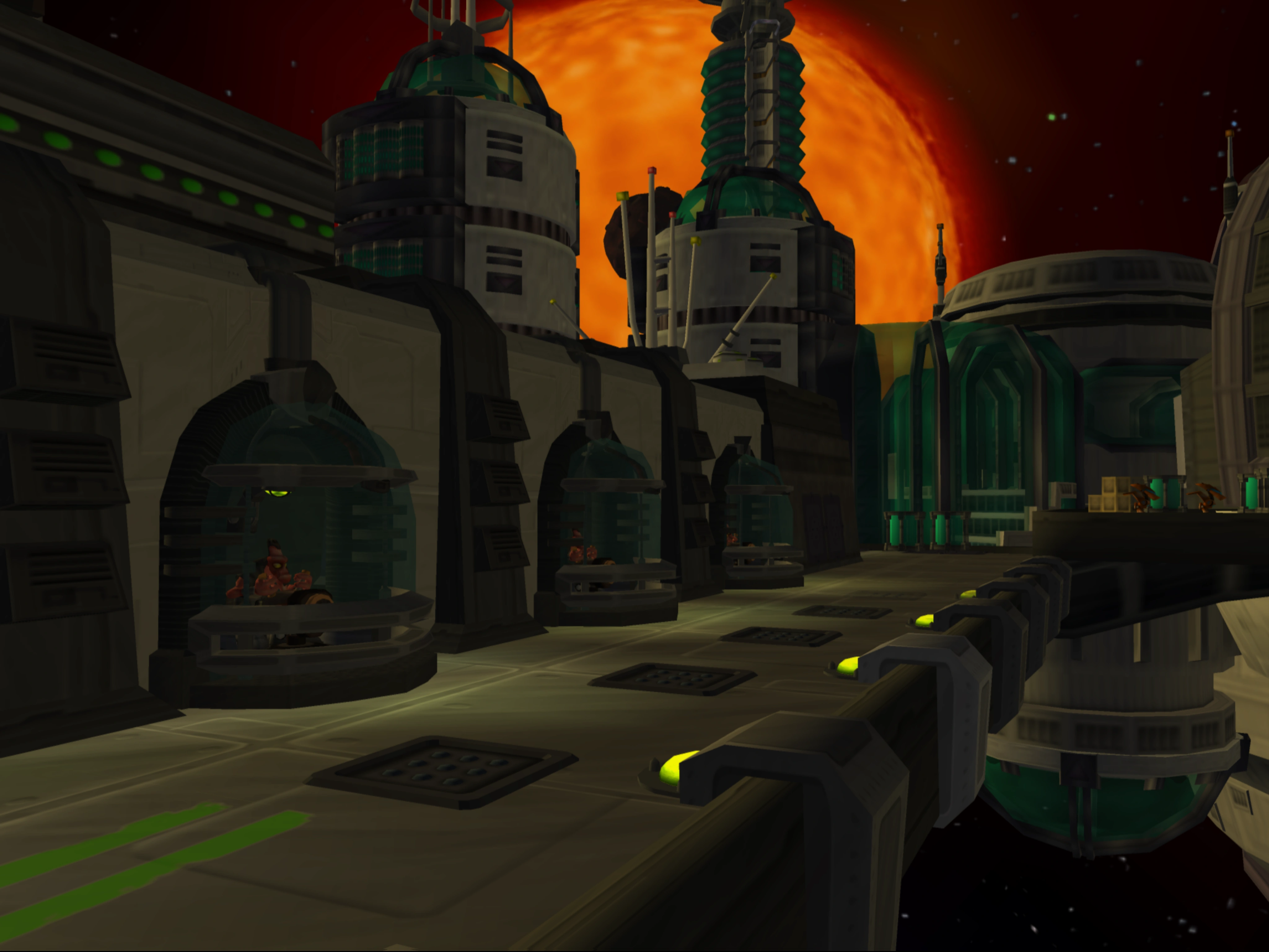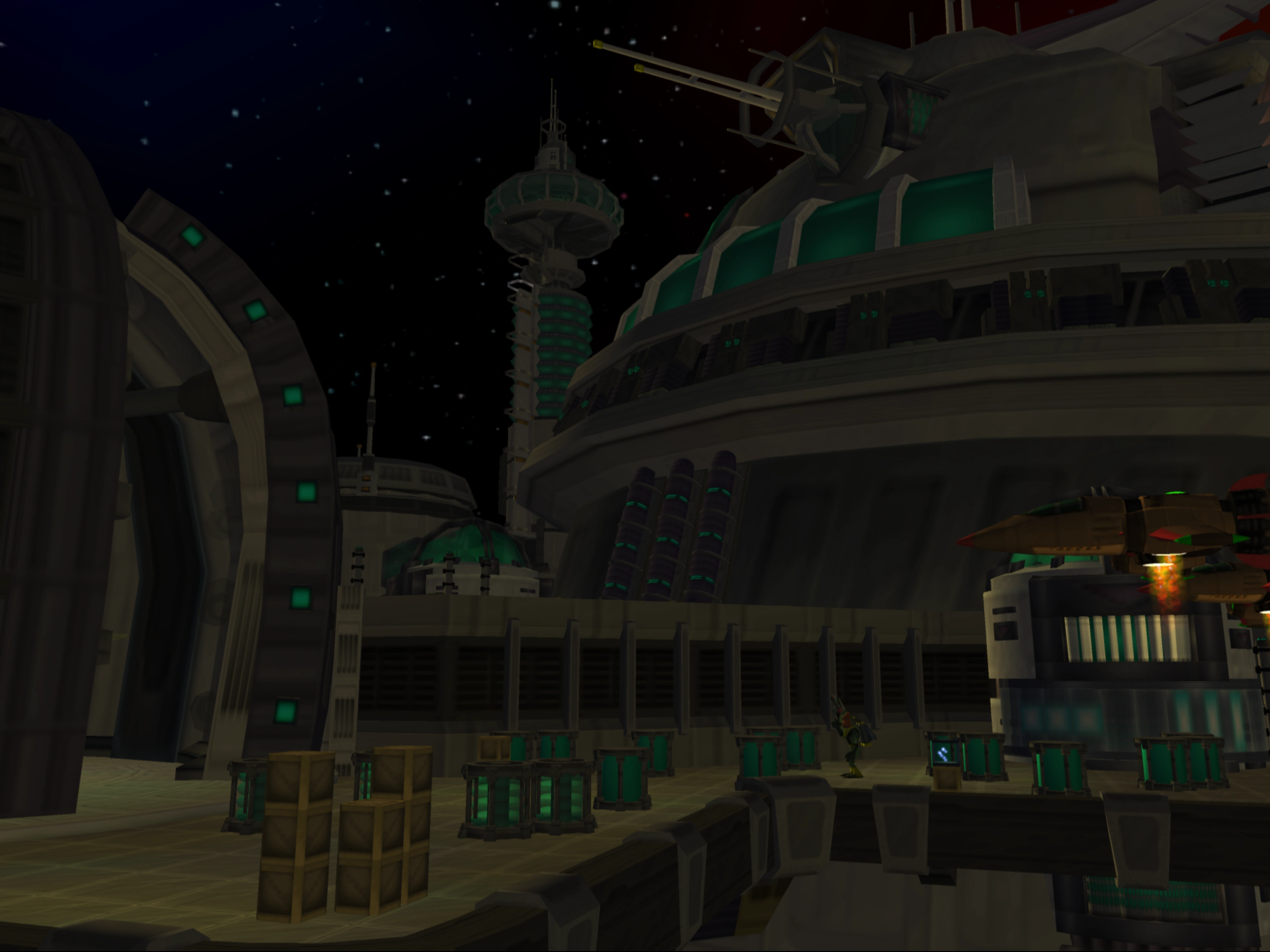 There is a lone landing pad, placed on a tower, at the southern end of the base. It is initially disconnected, though an extendable bridge allows entry once approached. This path will then lead through the south-eastern corner of the area, passing through two forcefields (supported by generators located in tall destructible towers), two gates with an Invinco-Lock, and three lone blarg gunners and their turret. Past the third turret is a number of glass barrels containing some sort of explosive green goo, located in front of a massive hangar. The hangar connects to a larger platform on the east side, with more barrels strewn throughout. On the northwest end of this platform is an elevator that leads to the interior of the ship on the north side of the base.