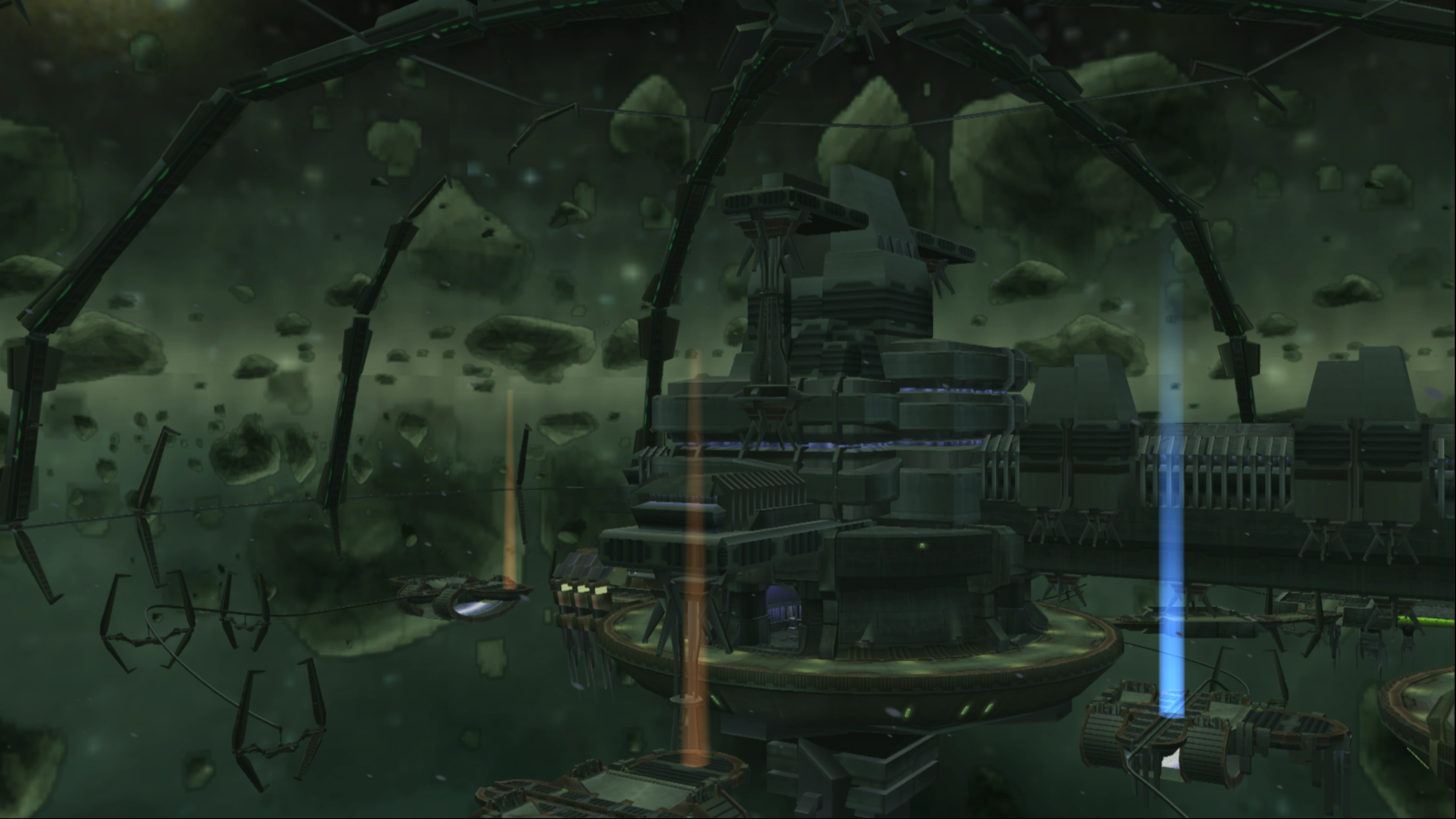 The Ghost Station was a space station located amidst an asteroid belt, with a green tint in the space surrounding suggesting it to be located within a nebula. The station comprised two floating high-tech structures connected to a docked warship, contained beneath a field of metal beams that join at the top and within a six phase theta glyph-encrypted forcefield.[6] Around the perimeter of the structures at the center were a few floating platforms just a distance from the central structures, which were joined together by grind rails.