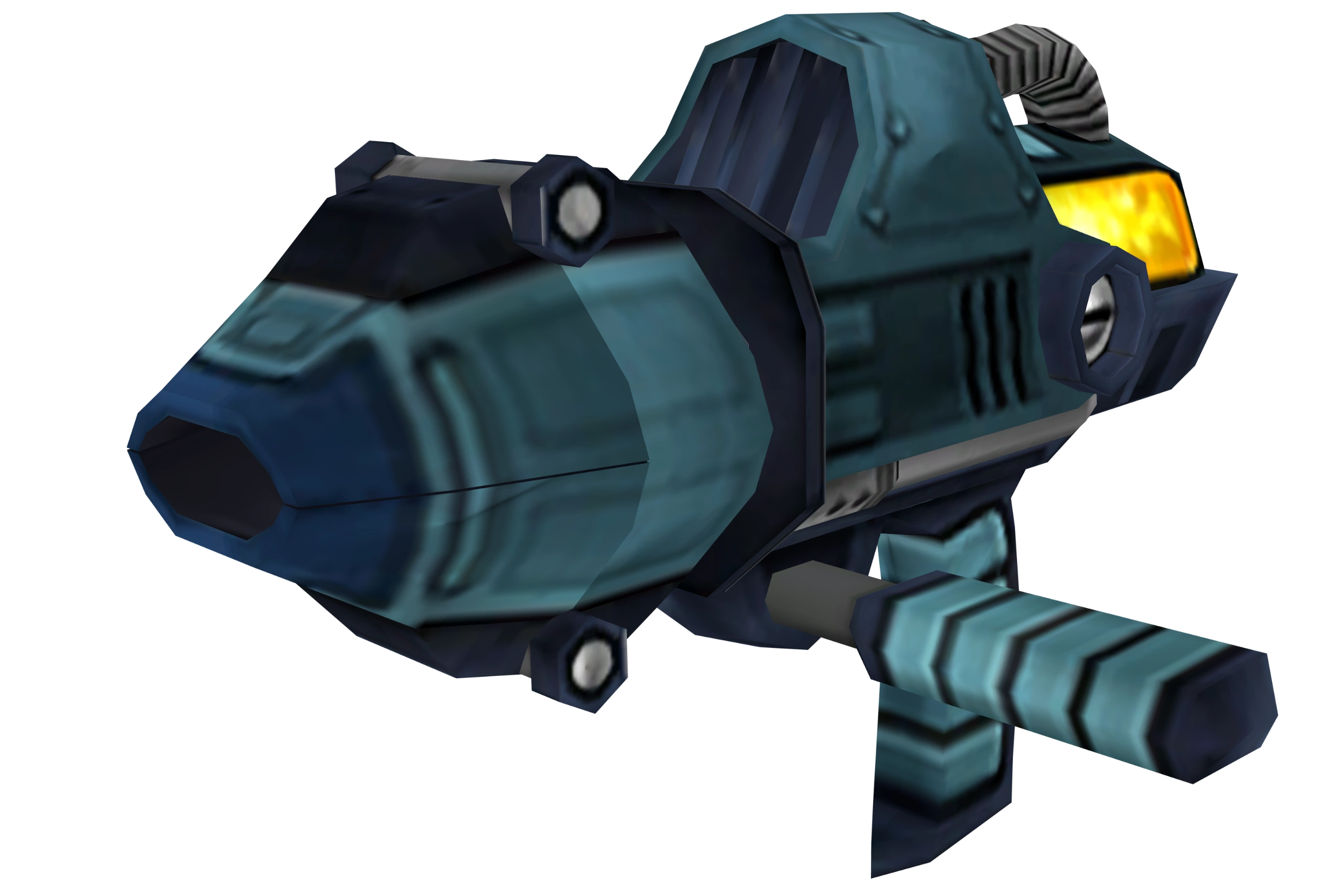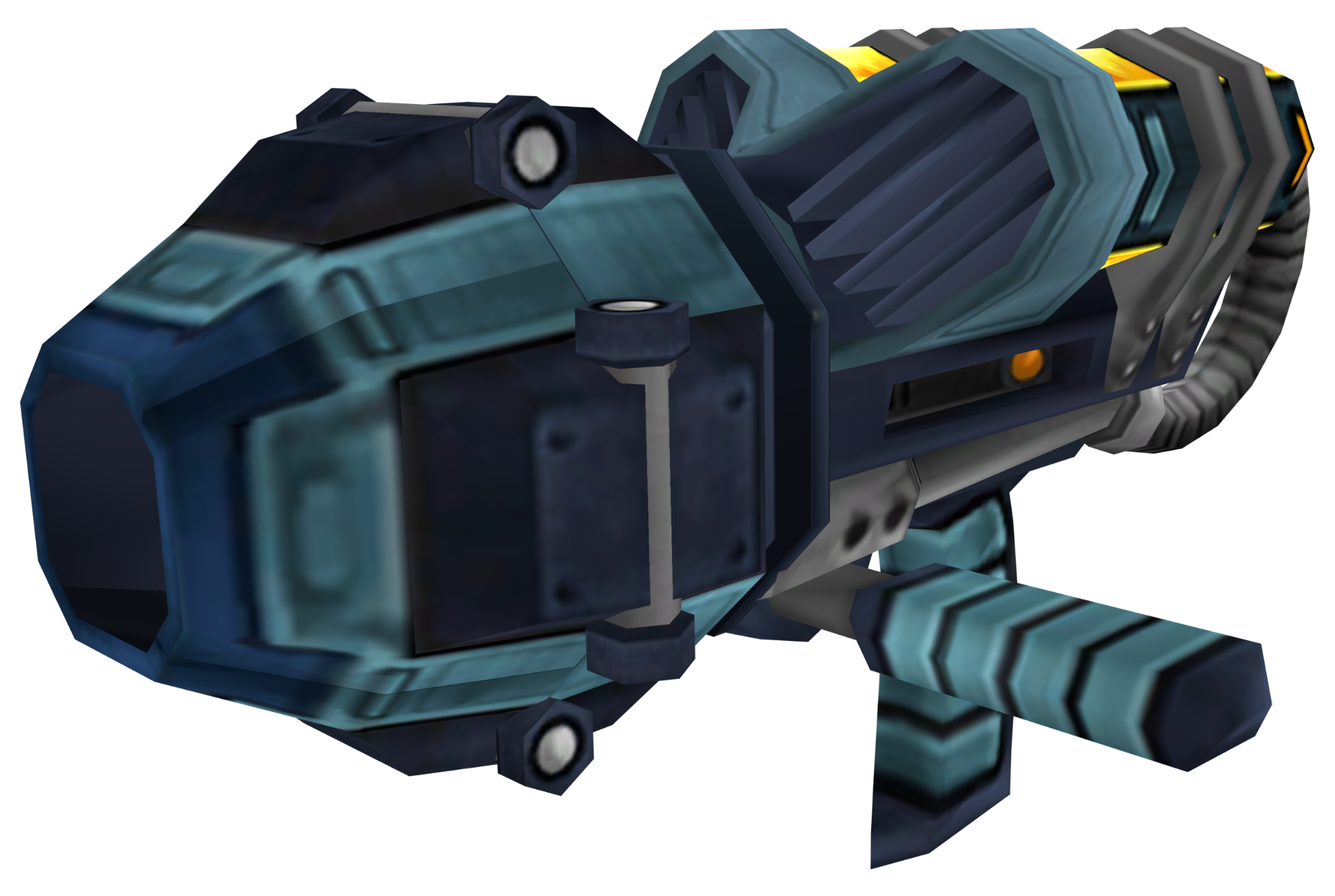 In Up Your Arsenal, the weapon is missing some minor elements to reduce polygon count, such as the tubes from the yellow generator on the back, which now covers the whole back. In Going Mobile and Clone Home it looks drastically different, sporting a yellow color with a bulbous barrel.