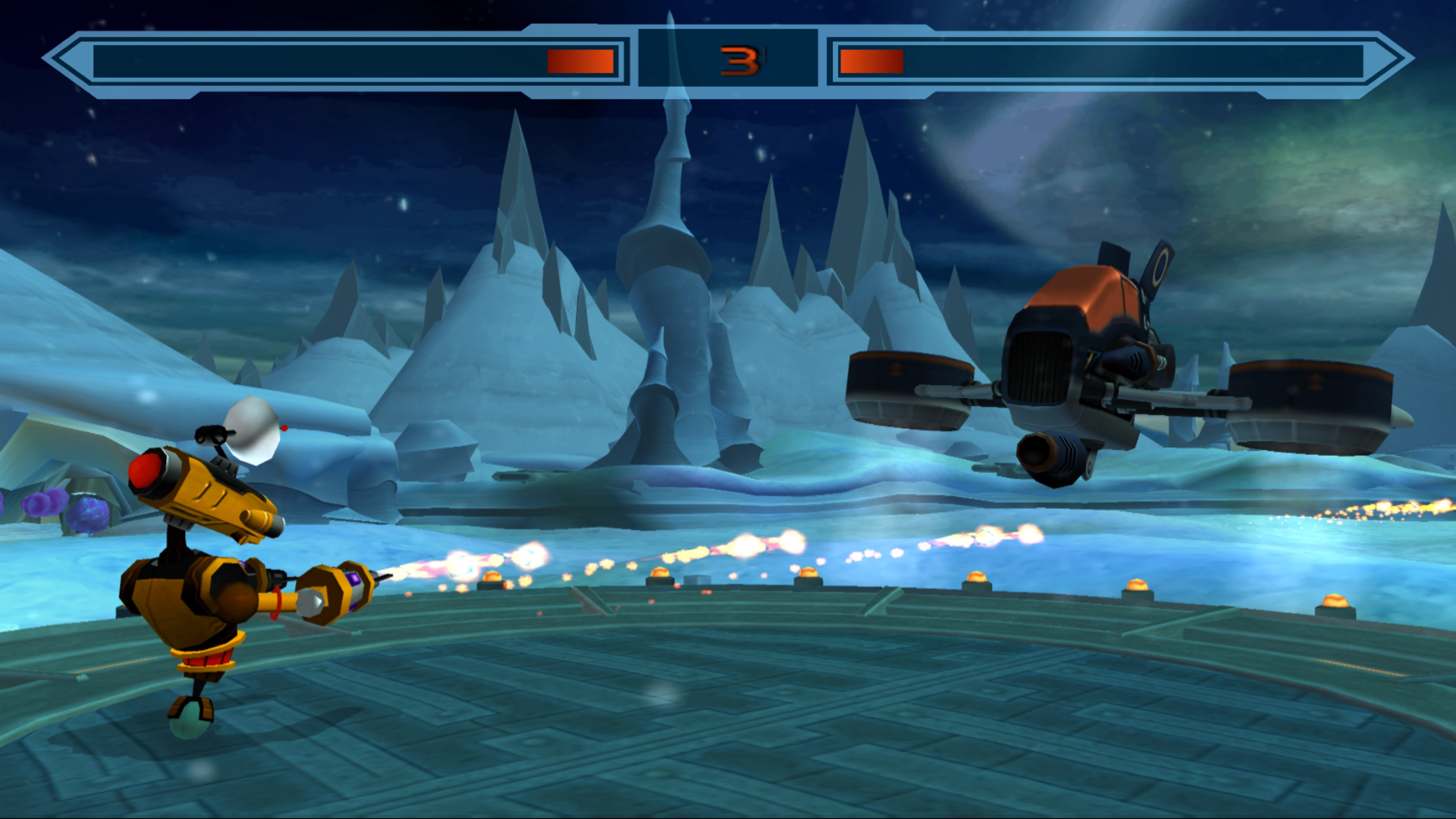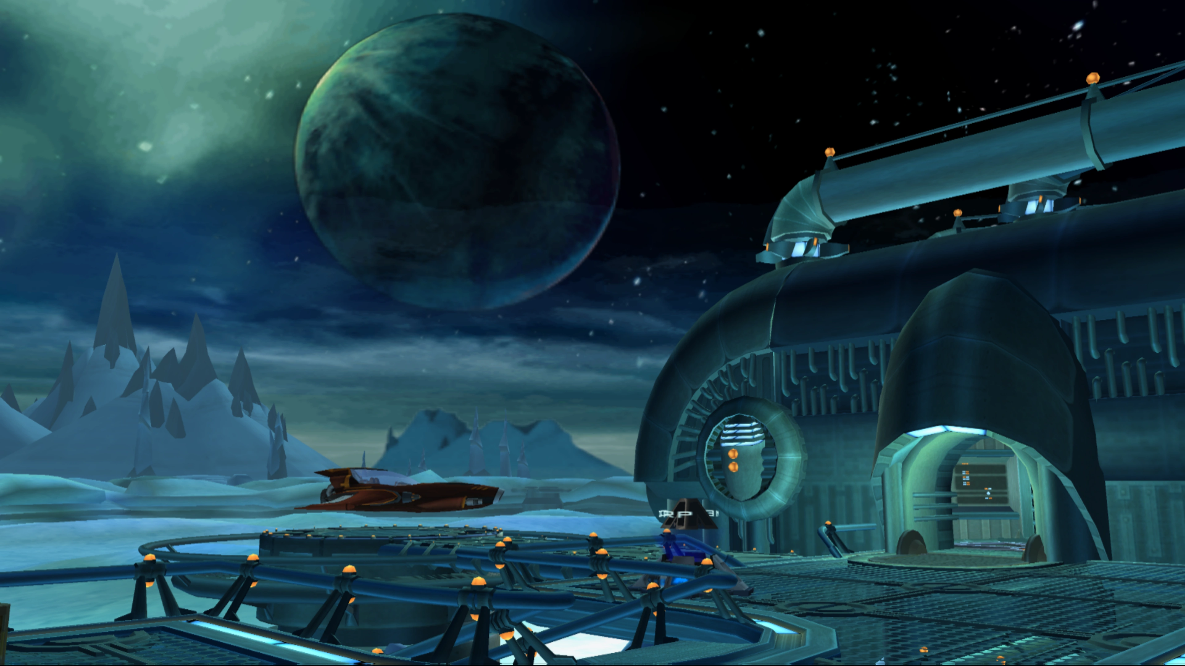 Grelbin is an extremely cold planet, and as visible from space, all its landmasses appear to be covered in snow, though its seas do not appear frozen. An aurora is seen in the sky, as well as three astronomical bodies, one large and two small, that appear to be close. Due to the cold temperature, Ratchet will shiver when idle and will freeze into an ice block if he falls into the water.