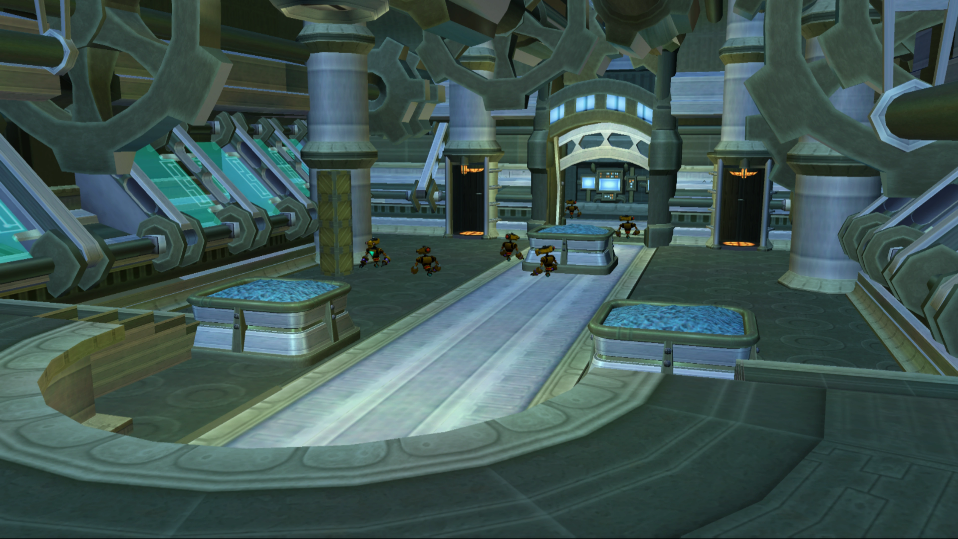 Both rooms are largely filled with water, with a solid walkway around them that can be traversed by Receiver Bots. The walkways also have forcefields blocking sections of the paths, and when the second room is flooded by water, a series of laser defenses guards against swimmers. An underwater tunnel in the second room also leads to a featureless room with a platinum bolt. The end of the second room contains an elevator shaft to an outside area by the factory, with a locked door leading to an inaccessible platform, as well as access to Angela's home.