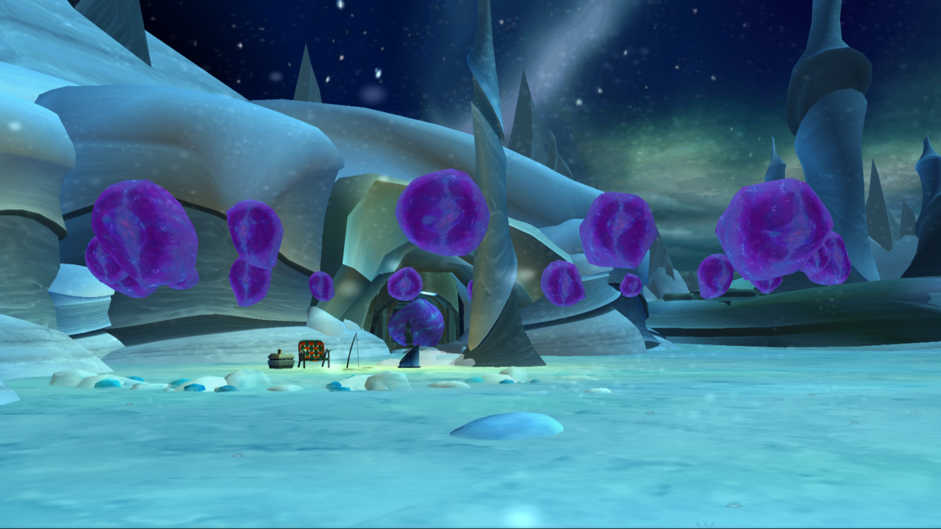 They are relatively hilly, uneven lands filled with burrows in which the Y.E.T.I.s dwell, and ice water pits in which the arctic leviathans dwell. In addition to these, several blue, crystal shells contain moonstones, while other moonstones are guarded by the leviathans. Many of the arctic leviathan pits are directly adjacent to moonstone shells.