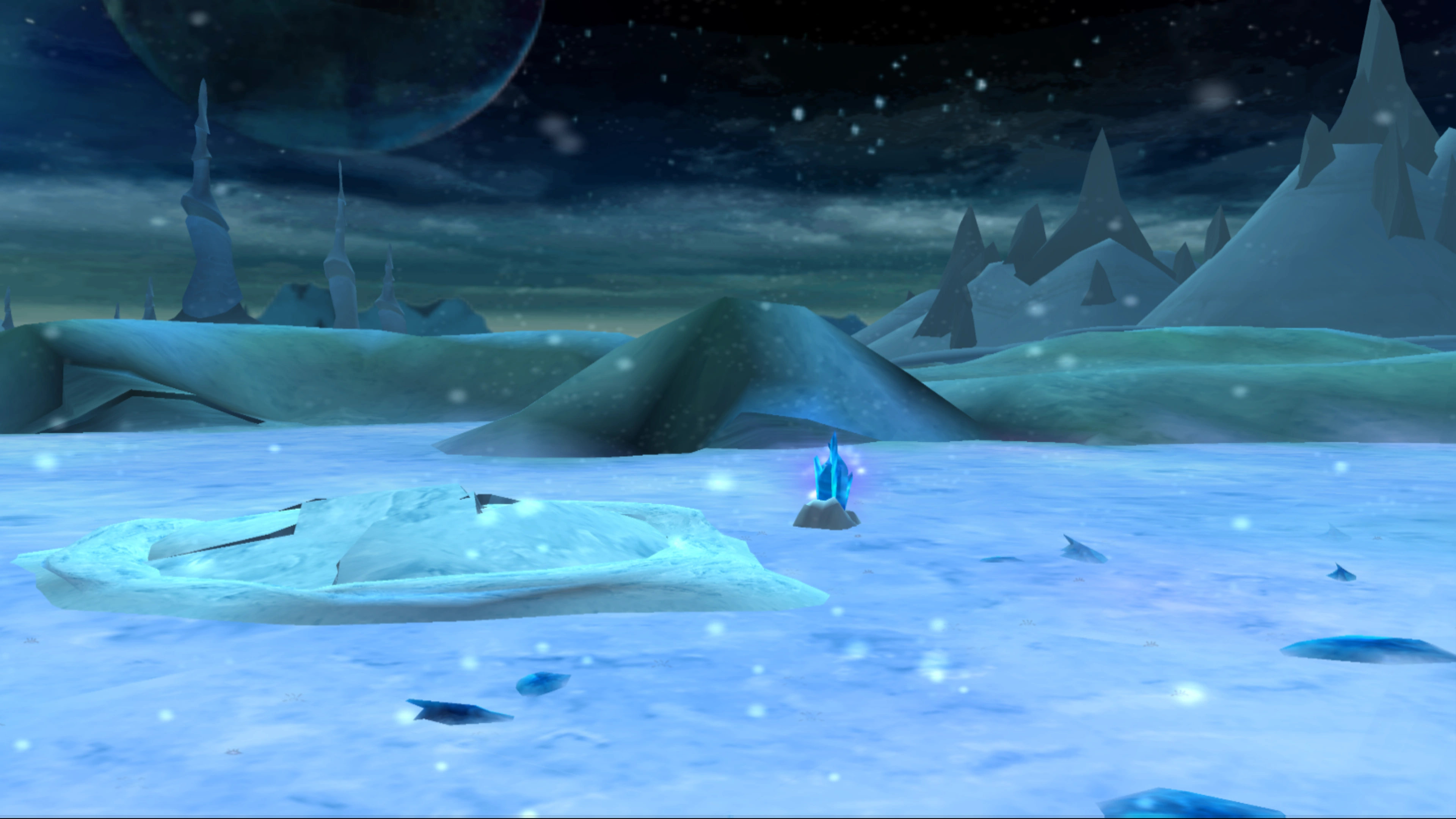 The ice fields are an expansive area where 101 moonstones are found. There are two sections to the ice field: a lower area adjacent to the factory where the ship lands, and a larger, elevated space surrounding it. The lower portion is surrounded by a steep rocky slope, meaning that the upper area can only be reached using bridges that are unlocked by in the mine shaft cave system.