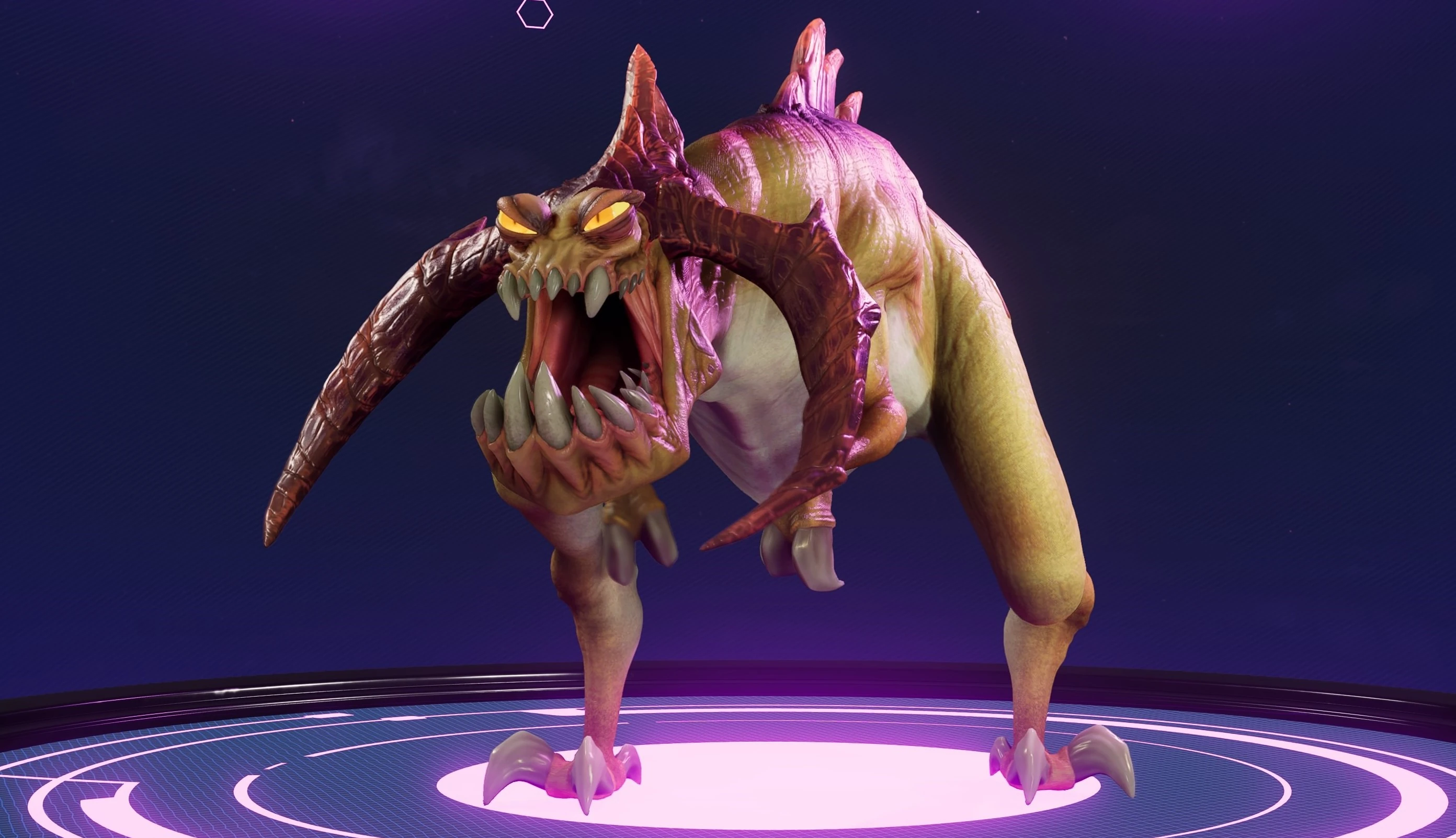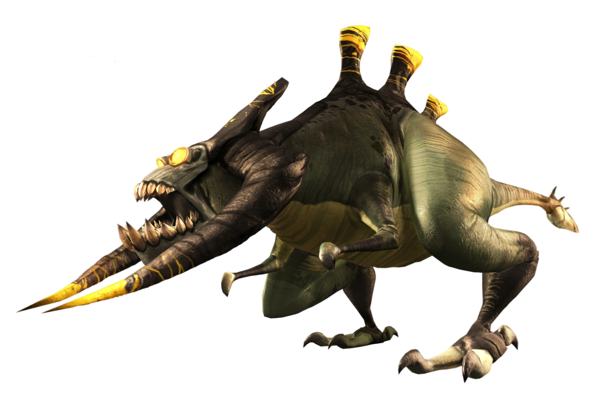 Grunthors are large bipedal beasts, akin to theropods, with lengthy horns and powerful legs that give them an ability to sprint. They have a stubby tail and large bony spines. Grunthor saliva is a poisonous and corrosive toxin deadly to all creatures in the known universe.[4] When unimpeded, grunthors appear able to rapidly increase their numbers.