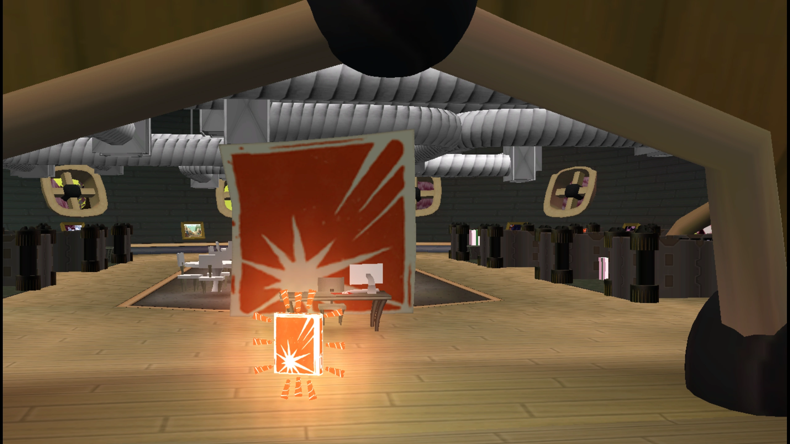 The first building mimics the developers' studio. There are several cubicles with work desks around the edges, and in the center are cafeteria tables and chairs. Exhibits are mostly contained within the desk cubicles, with some exceptions. Of these desks, one desk has a computer wrapped in bubble wrap, one desk has vinyls attached to it, and one near the Rutherford exhibit has two portraits: one with Courtney Gears in a heart shape and "xoxo cg" written on it, and the other with the Sexy Robot from Secret Agent Clank.