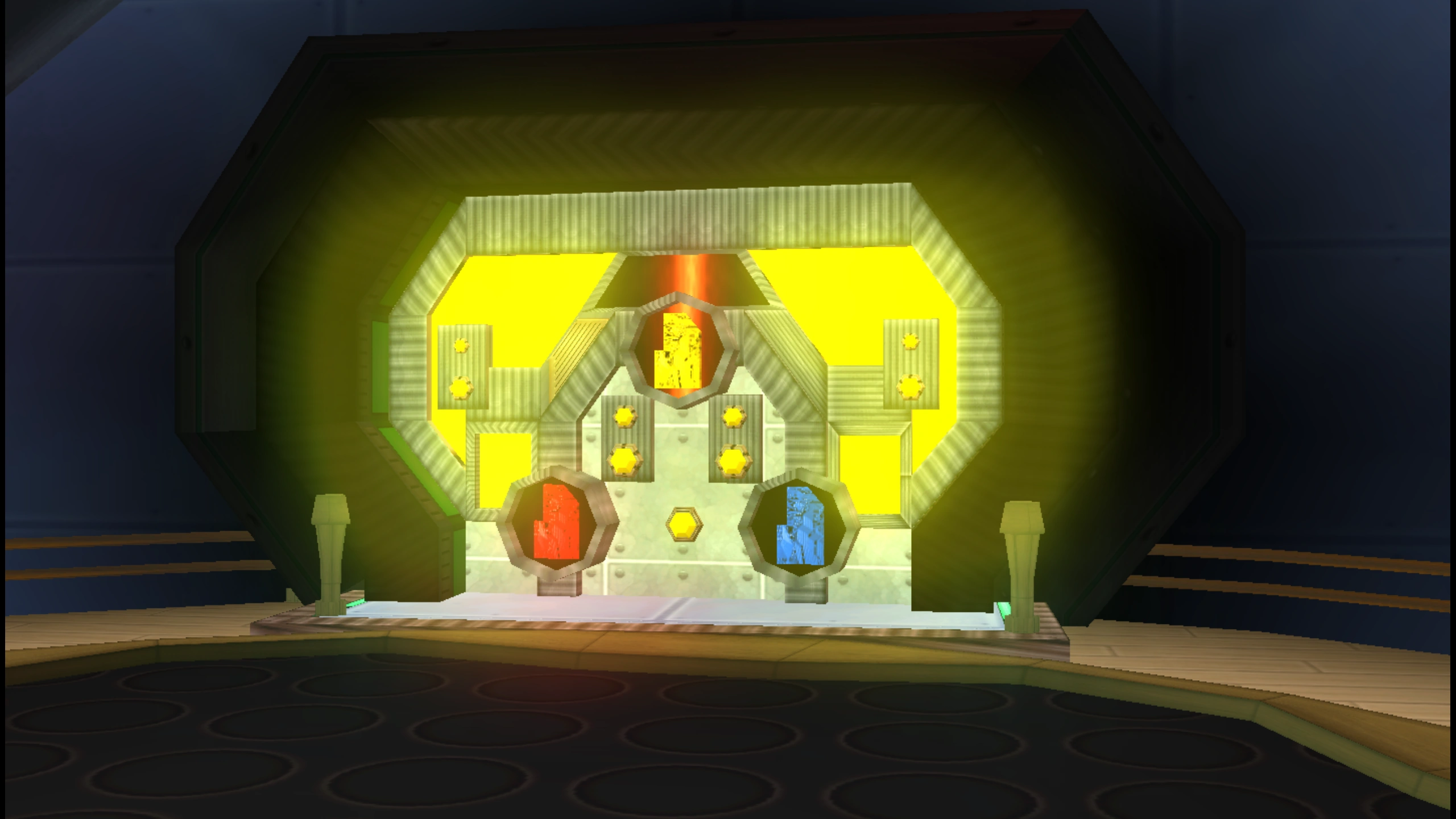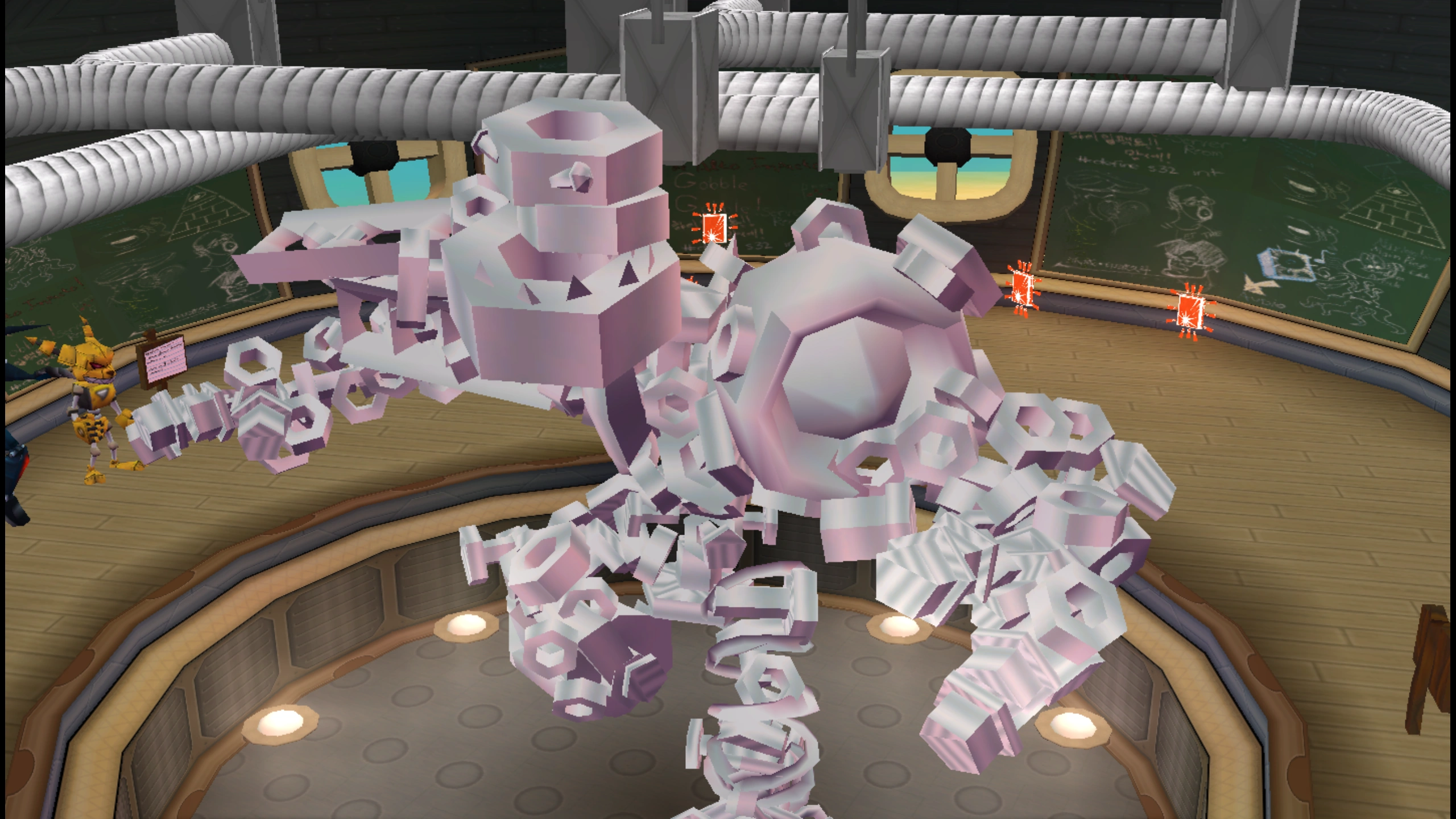 The Bolt Boss is located at the center of the room. This is a boss that was originally planned for Size Matters with the hopes of being included in Secret Agent Clank, that was never finished for either game. Animations of the boss can be viewed on approach by the player. A signpost reads: