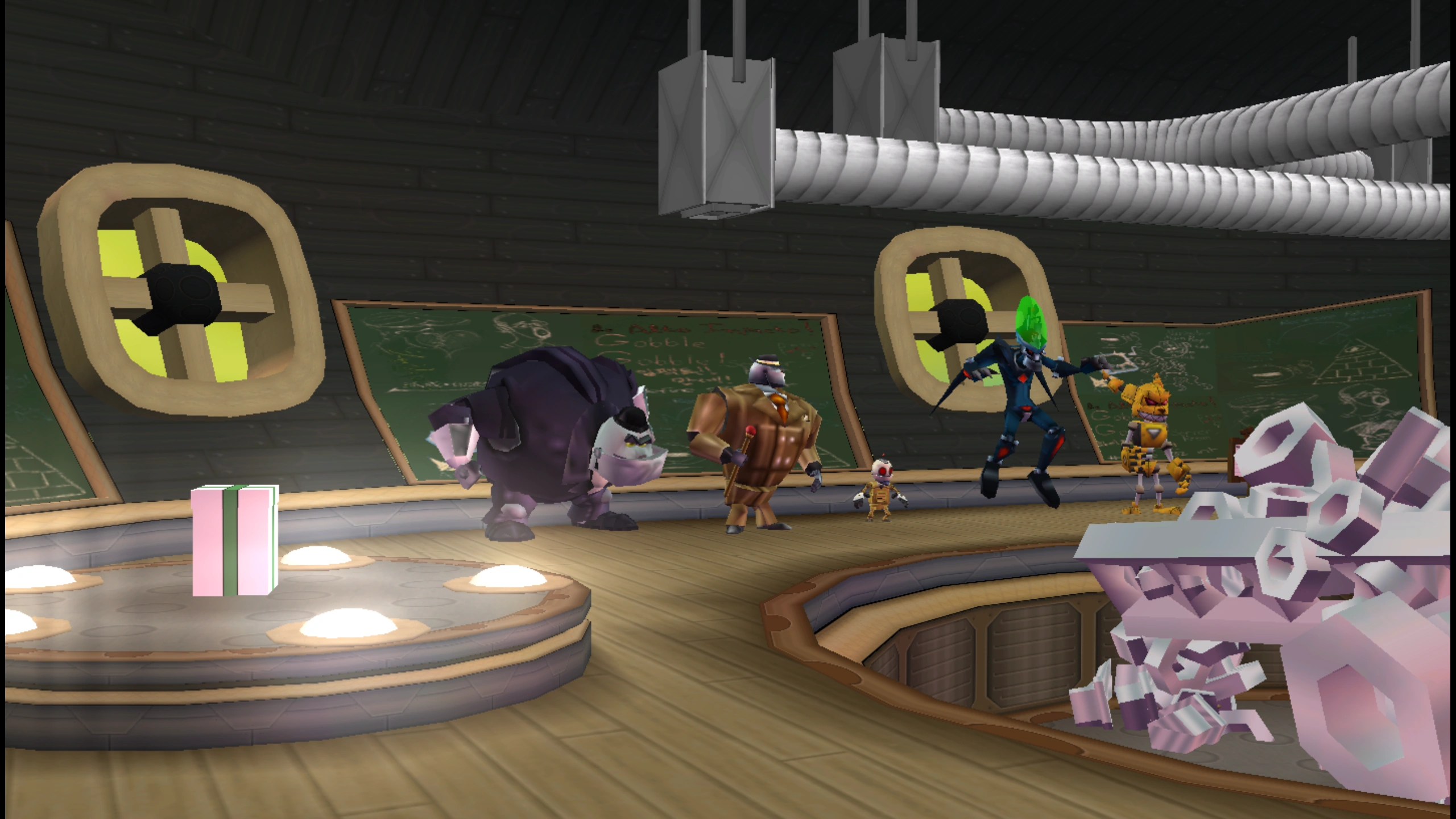Docile models of Klunk, Robo-Ratchet, Robo-Nefarious, the Kingpin, and Jack of All Trades appear in the back of the building. As the signpost states, the models simply appear to allow the player to use the Holo-Monocle on them to scan them for data that would otherwise be difficult for the player to read in-game.