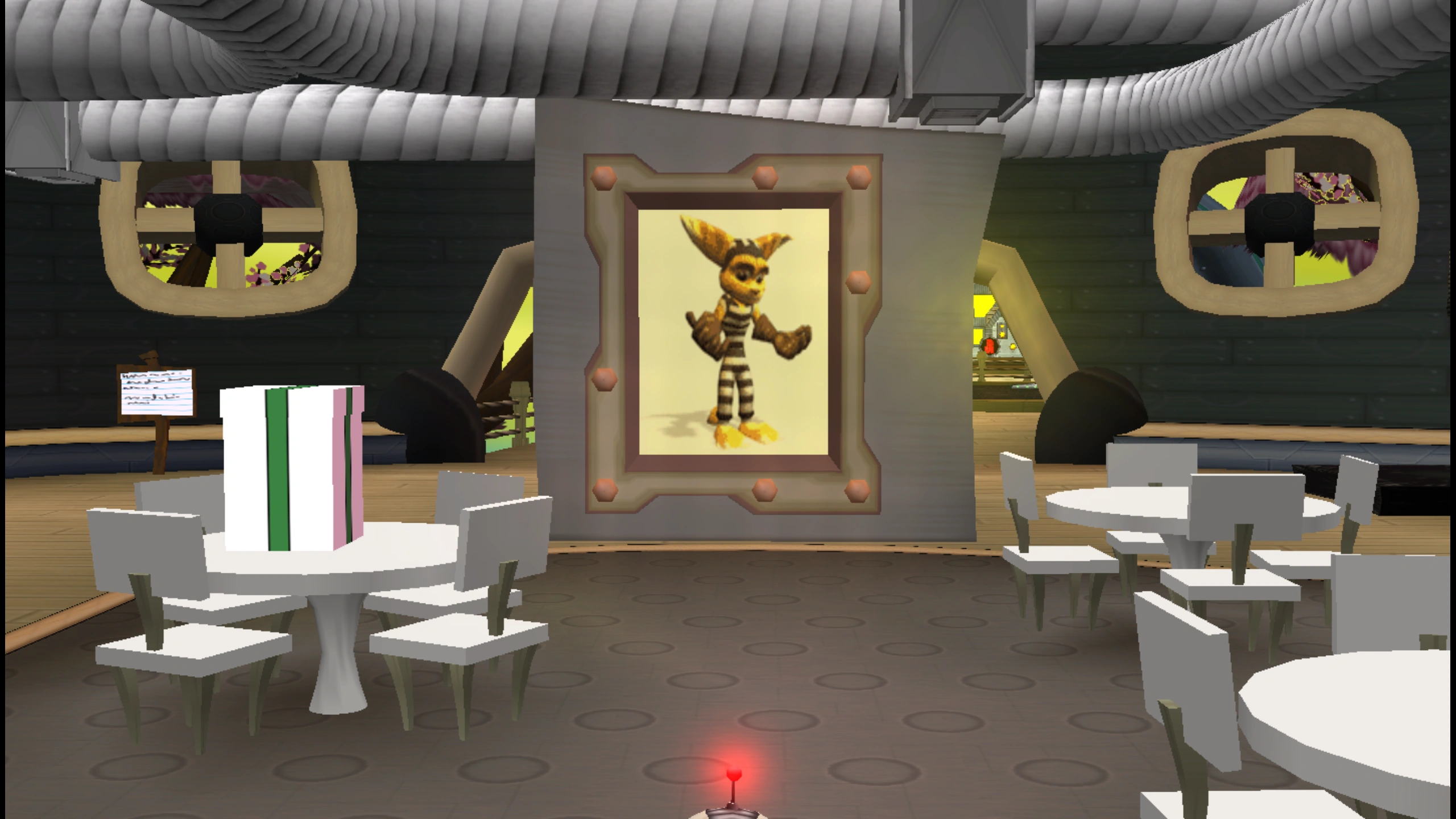 The right building is visited by taking a bridge to the right from the first building. This is mostly dominated by the main exhibit in the center of the room, and similarly does not mimic the studio. Clank's ship is visible in the sky by looking up in first-person mode while on the bridge.