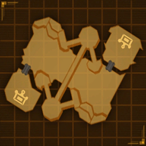 The zig-zag map has bases on opposite ends, each containing a Morph-o-Ray, drone bots, while protected by a small canyon. This canyon can be crossed by a destructible bridge or versa-targets. Destroying the bridge is a common tactic to create a defensible bottleneck. The first node past the bridge provides a turboslider, a Lava Gun, and Charge Boots.