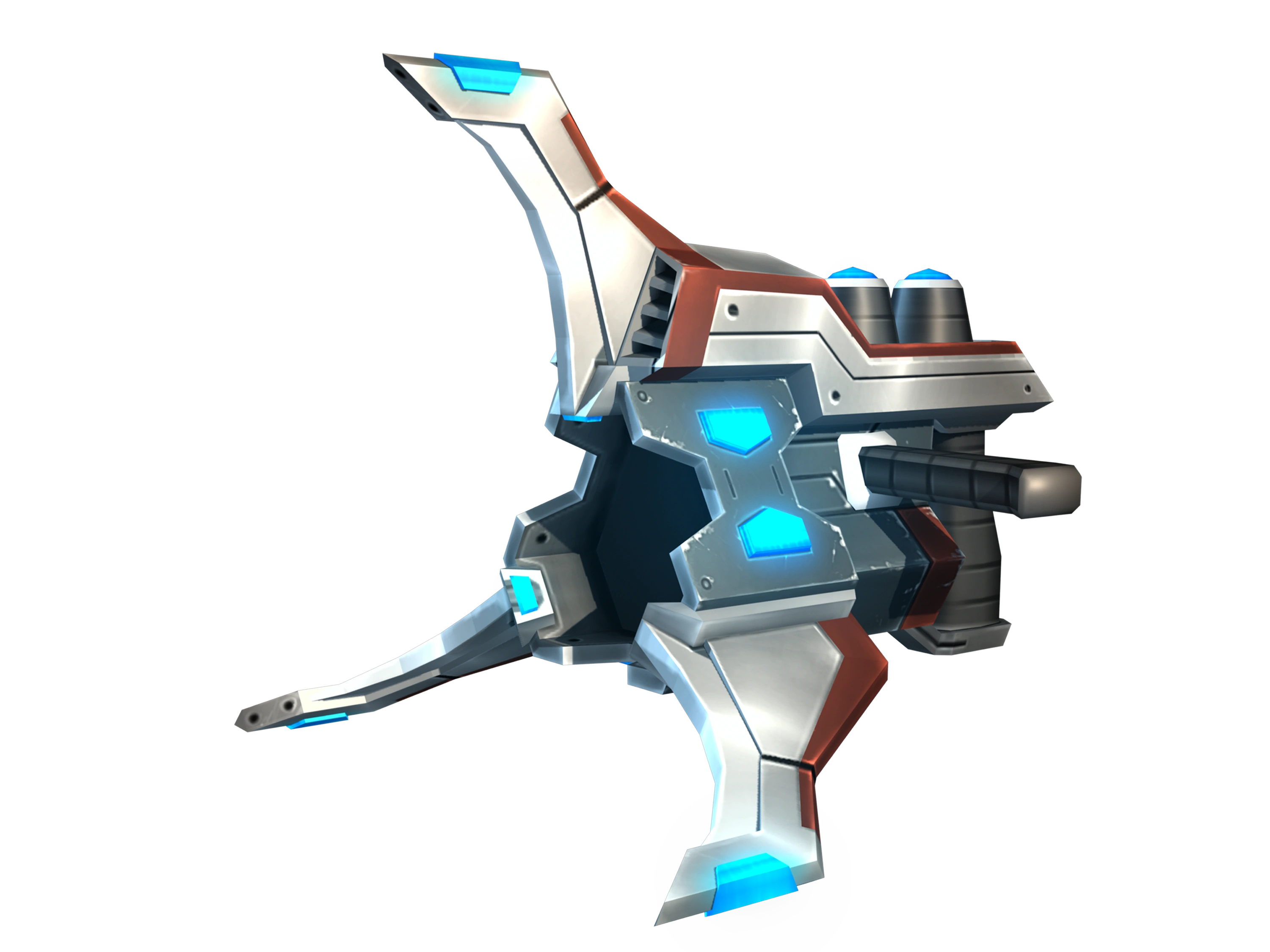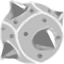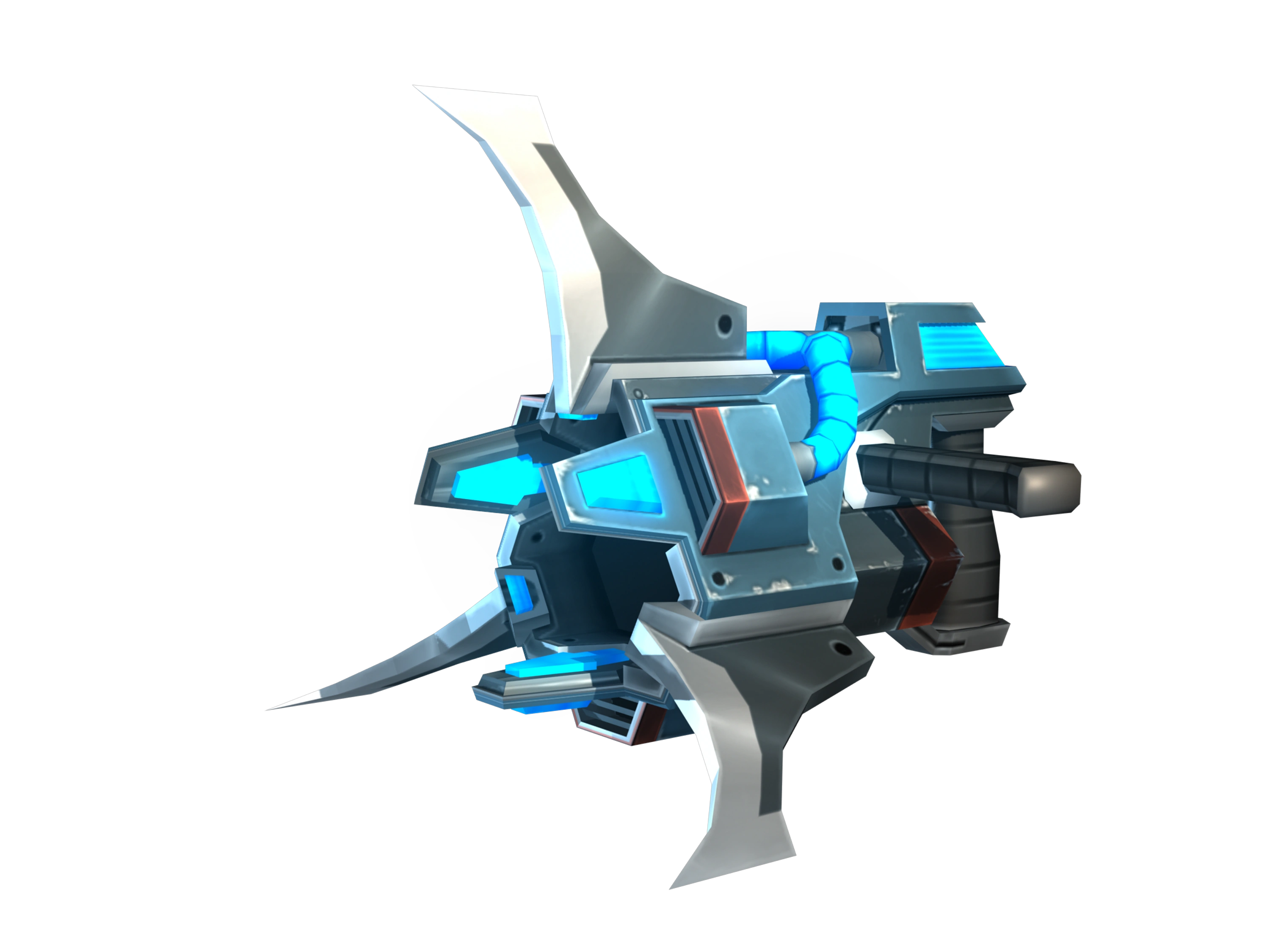 The weapon is a stubby, grey metal and dark blue weapon with a few bright cyan highlights and three blades that jut out from its wide triangular nozzle. The Stalker Mine Launcher is largely similar, though its design is much bulkier and its mines are bigger, and split in two upon exploding.