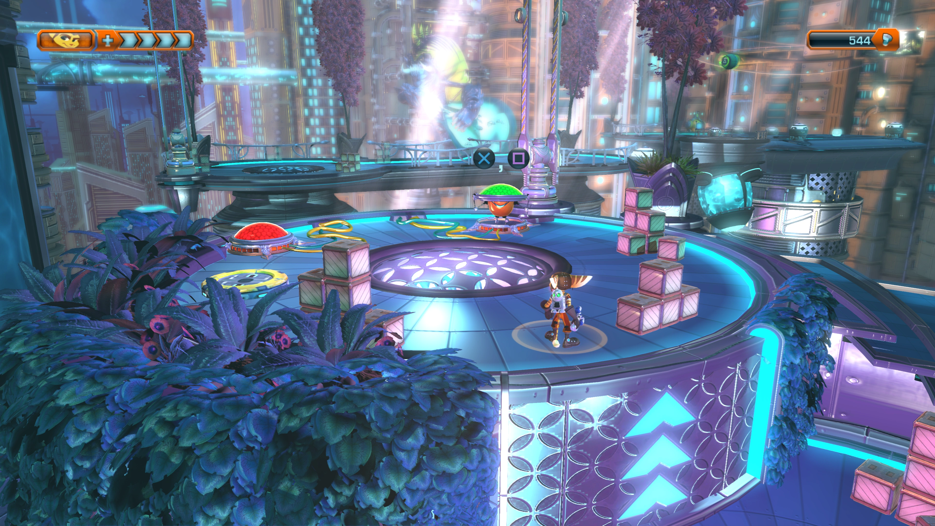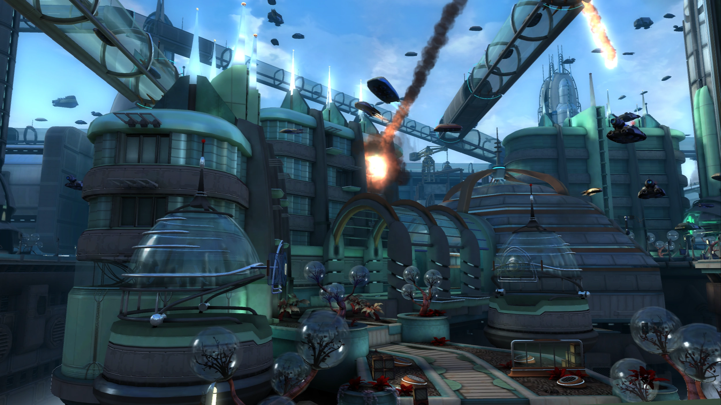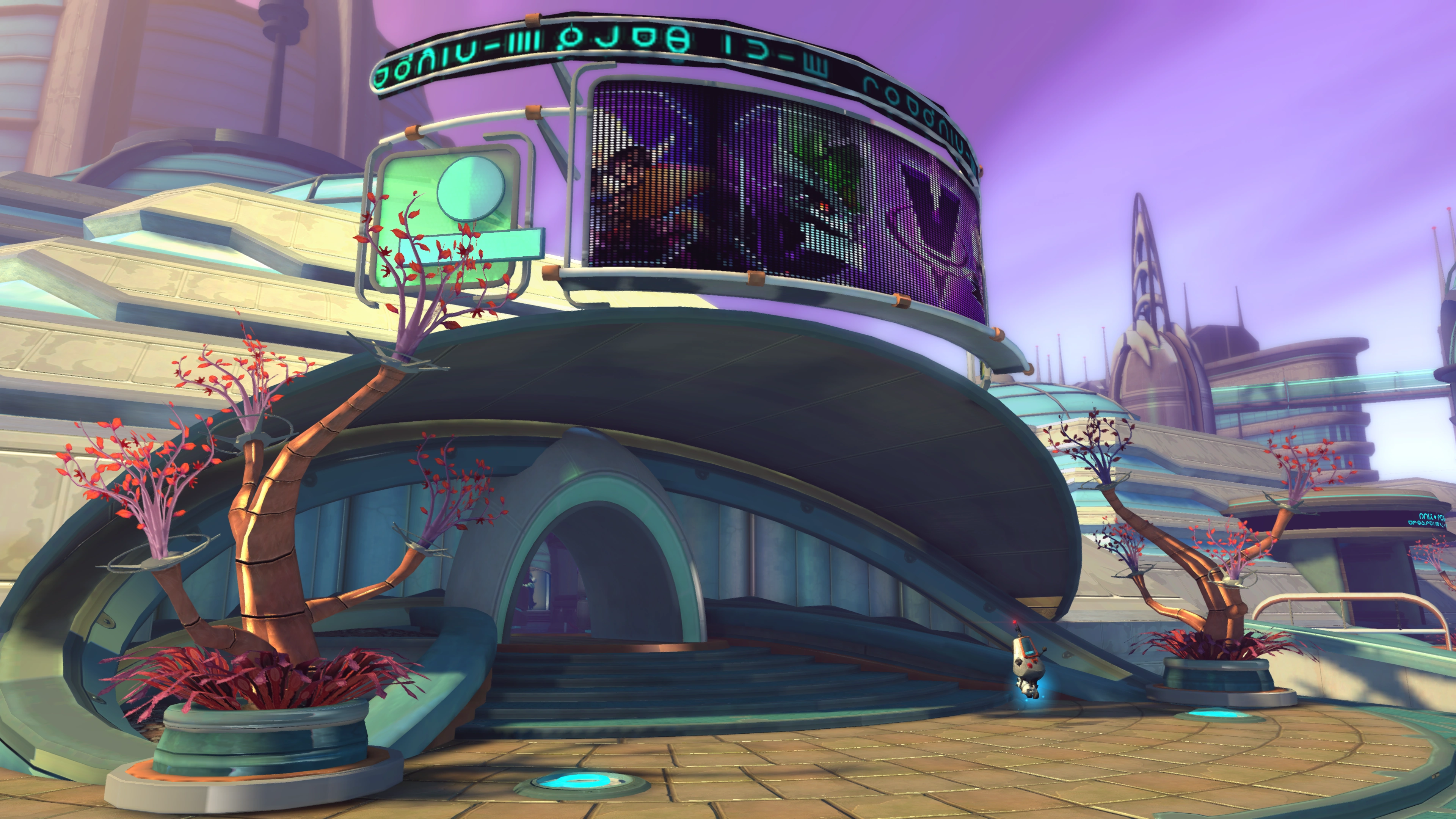 Meridian City is dominated by immense glass skyscrapers. The skyscrapers have round dome-like roofs, suggesting similarity to lombax design on Fastoon. Around its rooftops are several large red trees, with various branch tips encased in glass spheres.