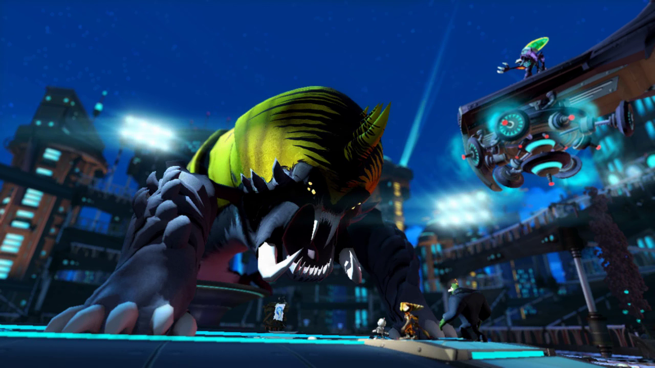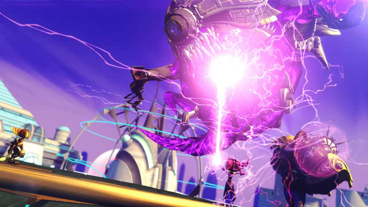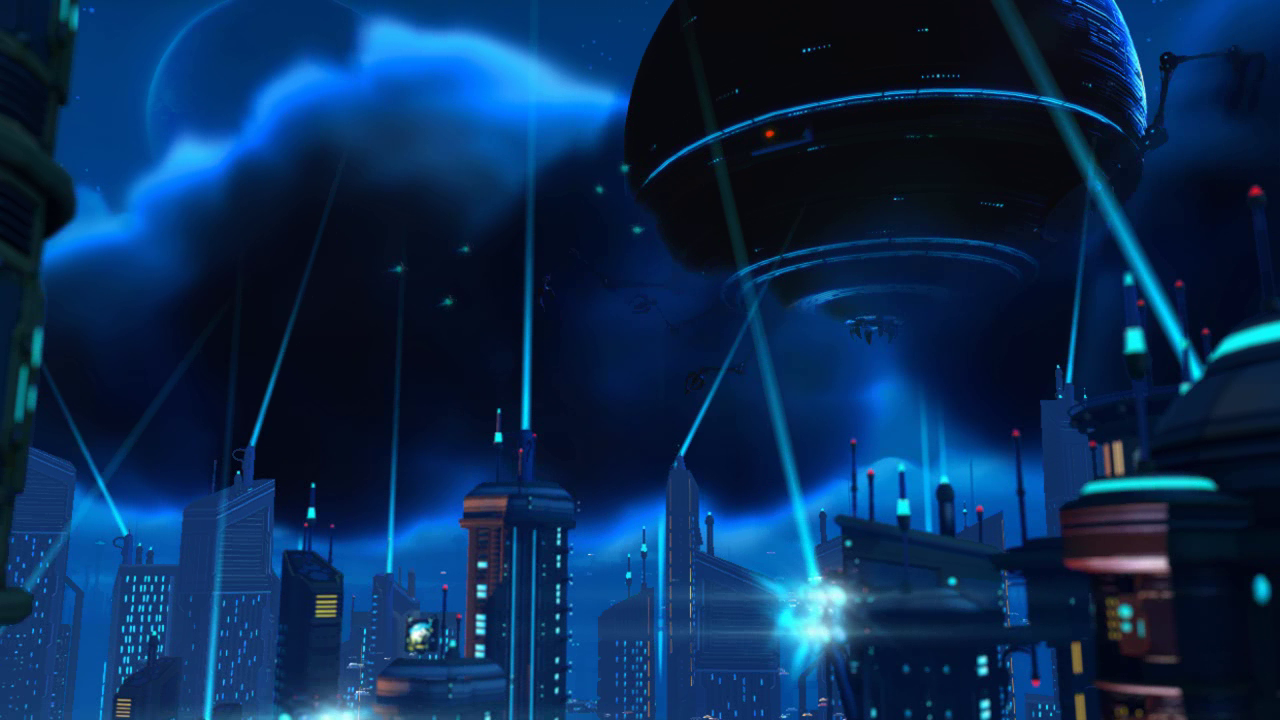 After Mr. Eye and the nethers were summoned into reality, they invaded Meridian City. Spotted by a Polaris satellite, Mr. Eye destroyed six watch posts in the Cerulean Sector on the way to Meridian City. With the Polaris Defense Force occupied by Thugs-4-Less, the city was defenseless. After Talwyn, now a Polaris Defense Force captain, alerted Ratchet to this and pledged to engage the threat herself, Ratchet encouraged her to instead call a state of emergency as he arrived to protect the city.[27]