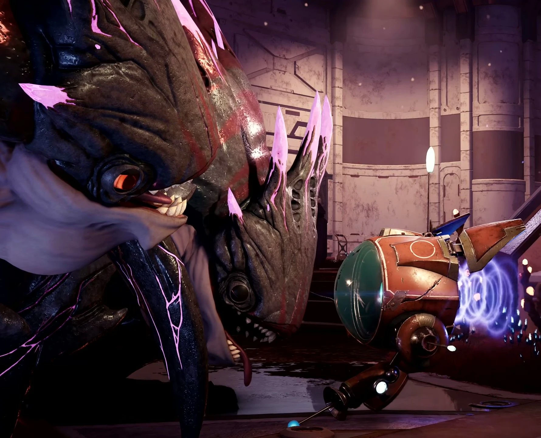In dimension ???, a counterpart of Junk Bot also worked at the facility at some point in the past. Some time several years prior to the events of Rift Apart, Junk Bot discovered a mysterious creature swimming in the Cordelion oceans, that he grew a fondness for and developed a friendship with. Upon revealing the existence of the creature to the other workers at the station however, he was dismayed when they forcibly captured it and used it's extreme amounts of bio-electricity to make it a living battery for the Rubion Forge. Junk Bot later in his distress broke the creature out of it's containment and it proceeded to decimate the facility, leaving it abandoned for several years.[1] This alternate dimension appears to be an offshoot of Rivet's, the old remains of Nefarious Troopers in the abandoned station indicate that an alternate Nefarious Empire and presumably an alternate Emperor Nefarious was in control of the facility at one point before the creature broke free and went on a rampage. During these years, Junk Bot named the creature Juice and stayed with it on the abandoned station, where the utility bot's mental health deteriorated in his extended isolation. In Rivet's dimension, a counterpart to the creature was first discovered by Emperor Nefarious, who also had it captured and used as a power source for his Rubion Forge. Here, Junk Bot had no such relationship with the creature, meaning it never escaped it's confinement and remained a battery.