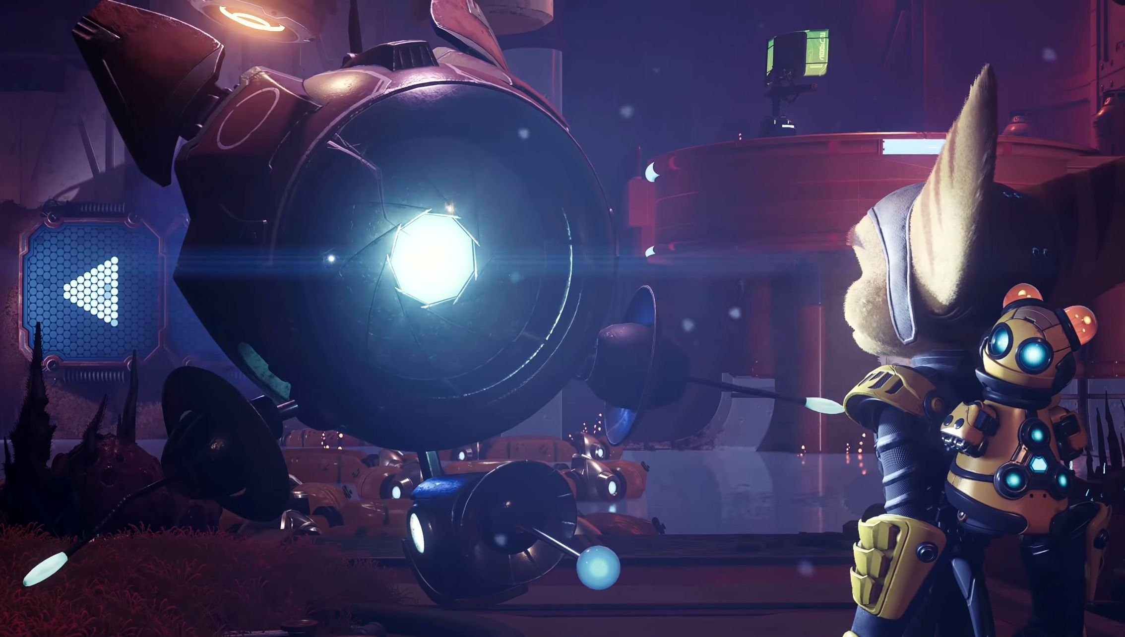 Ratchet and Kit are confronted by Junk Bot's counterpart at the Rubion Forge.